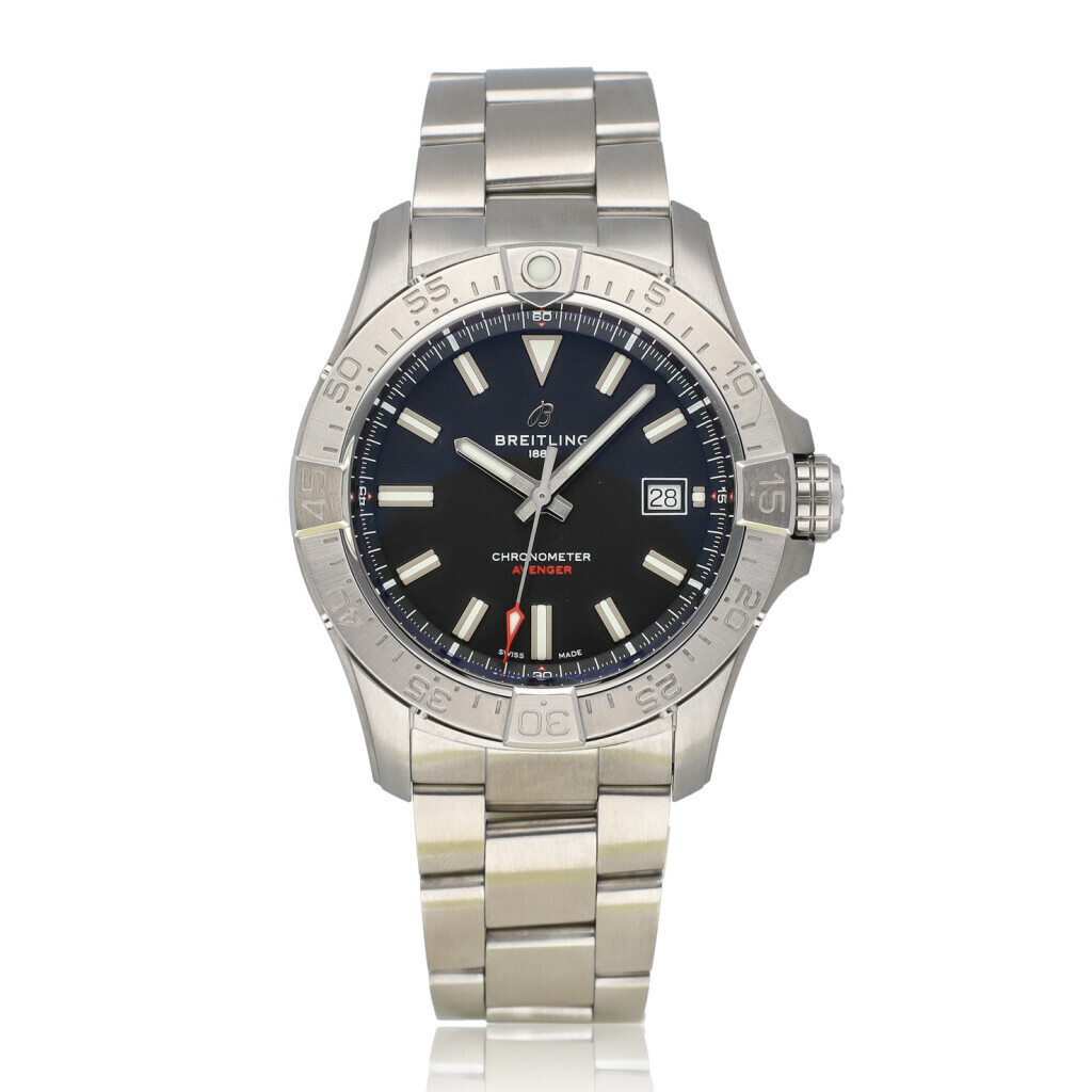 In very good condition Breitling Avenger Automatic in steel with black dial and steel Breitling bracelet from 2024 complete with box and papers.