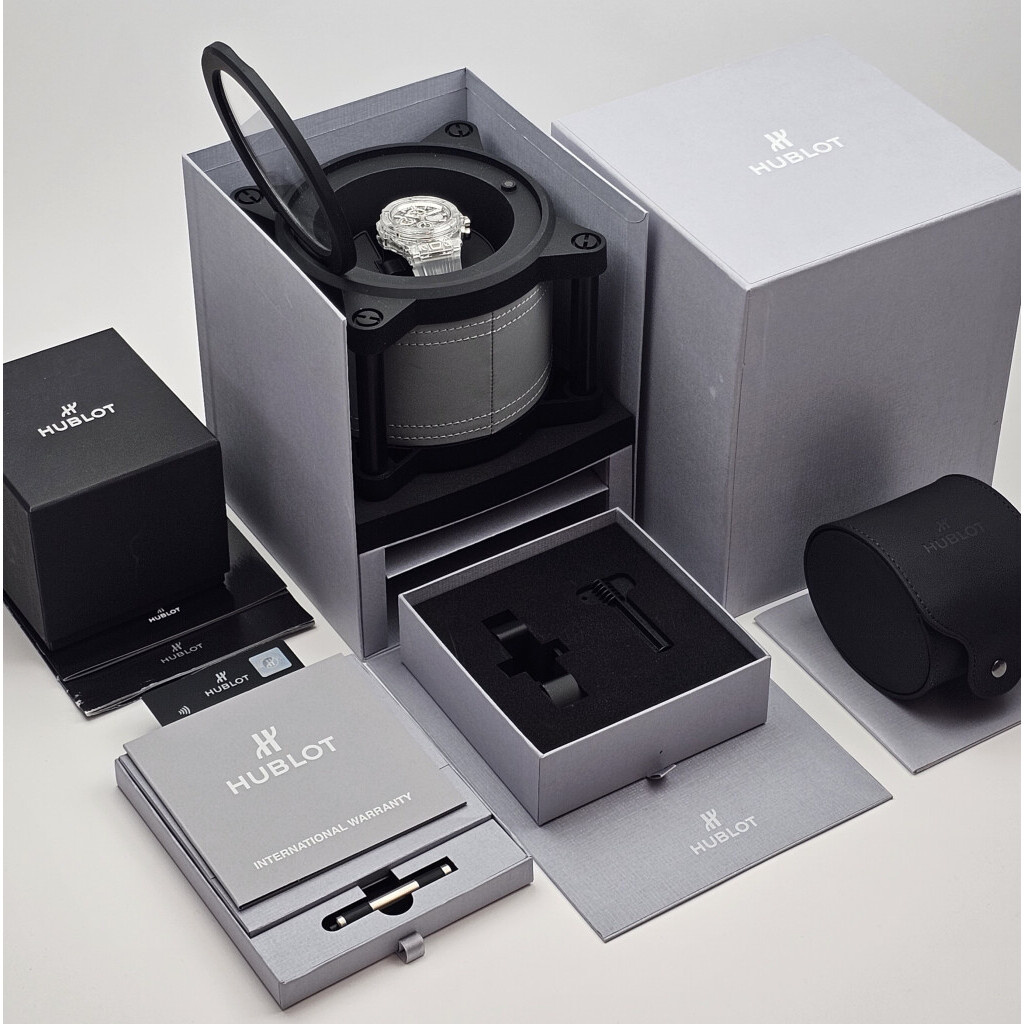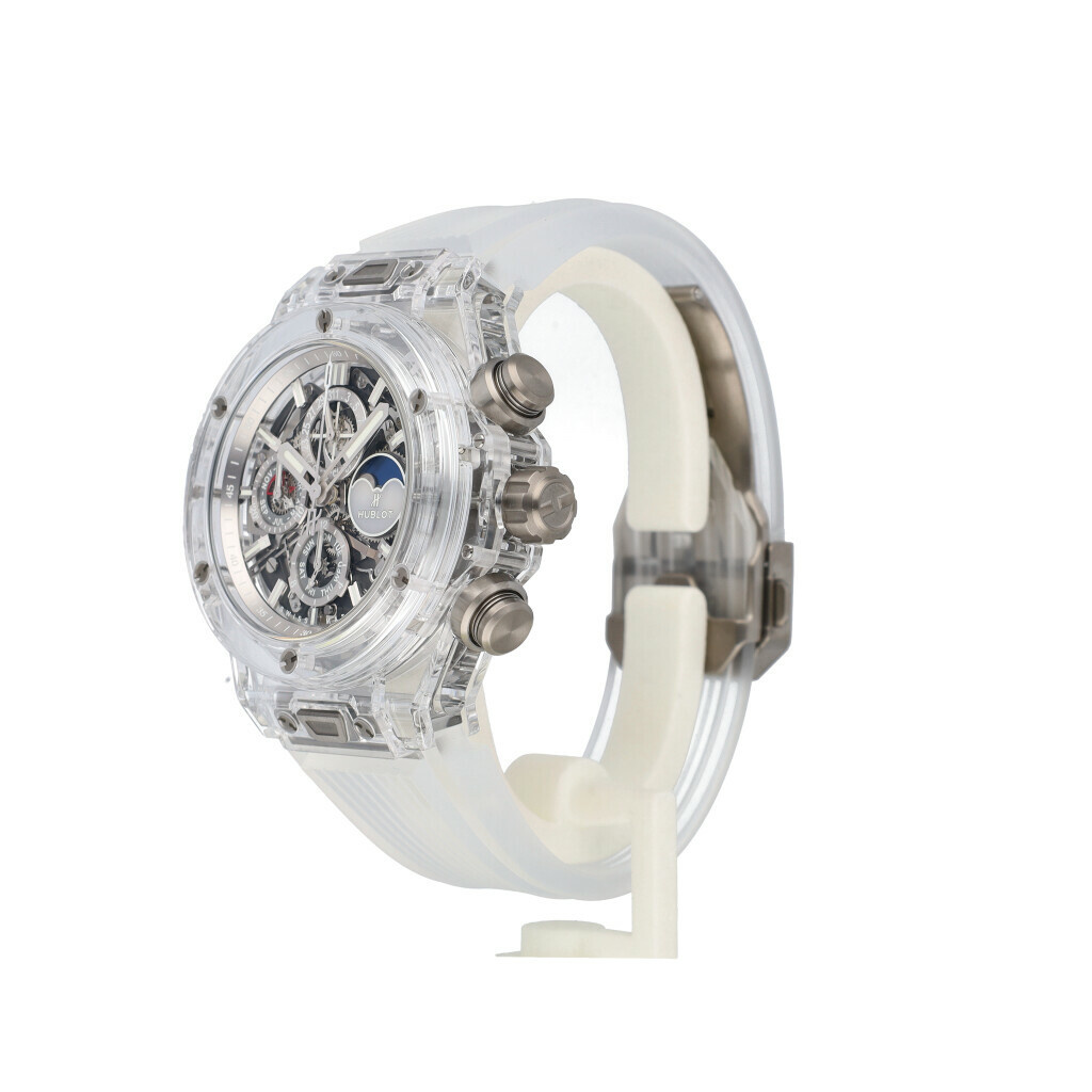 In very good condition, Hublot Big Bang Unico Sapphire Perpetual Calendar skeletonized in Sapphire complete with box and papers.