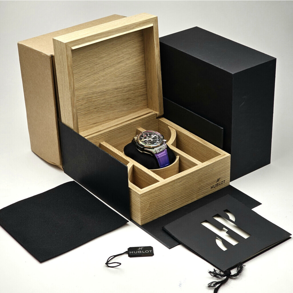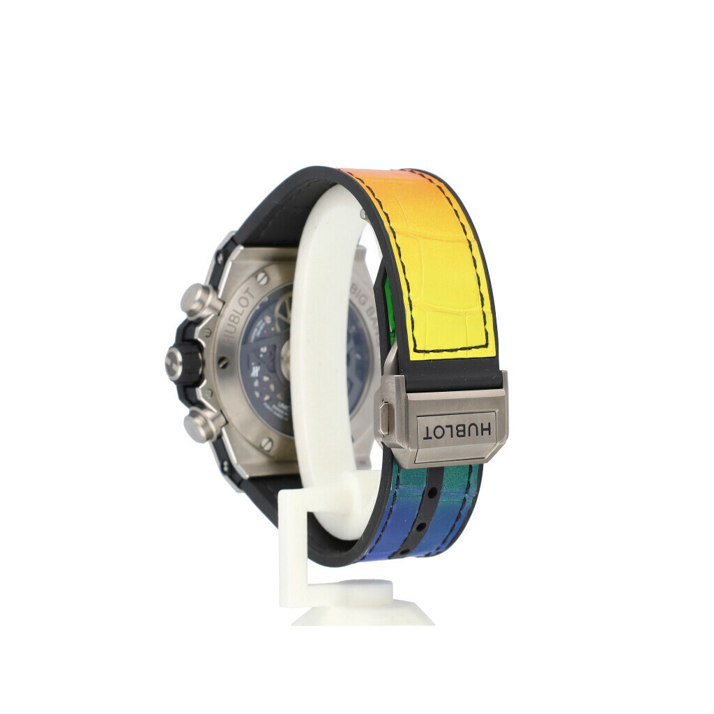 In very good condition Hublot Big Bang Unico rainbow in titanium with see through 'skeleton' dial, factory diamond rainbow setting and leather / rubber Hublot strap from 2025 complete with box and e-certificate (= Hublot certificate) 21% VAT deductible when shipped outside of the European Union.