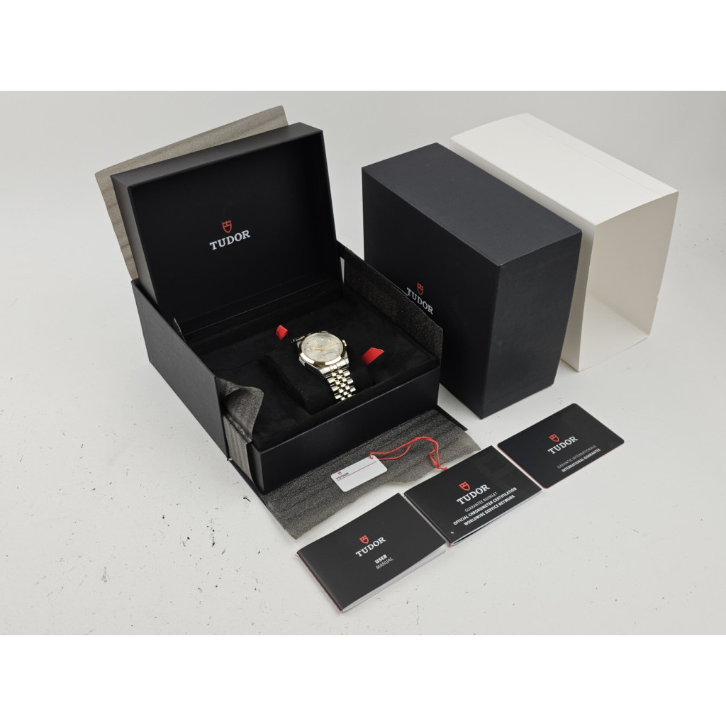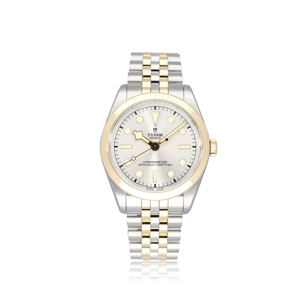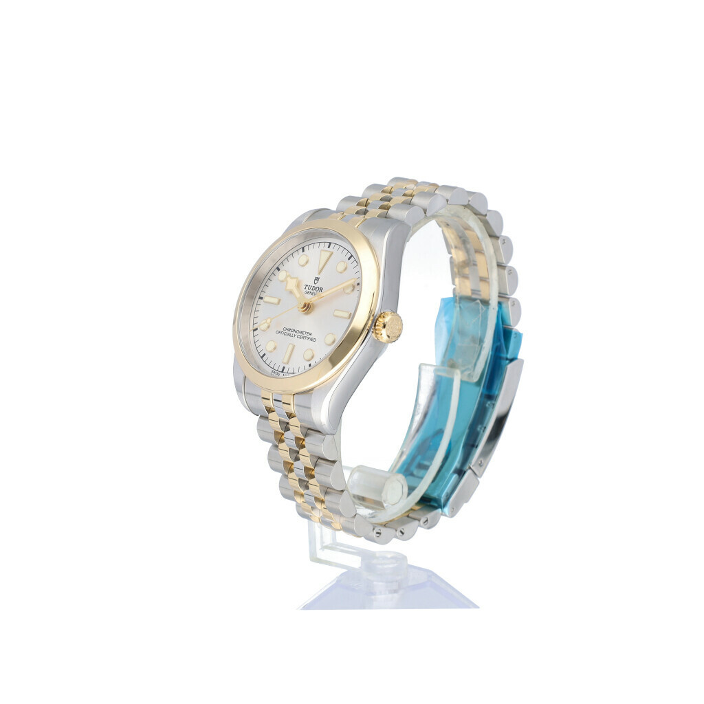 In fair condition Tudor Black Bay 36 in steel and yellow golf with silver dial from 2024 complete with box and papers. 21% VAT deductible when shipped outside of the European Union.