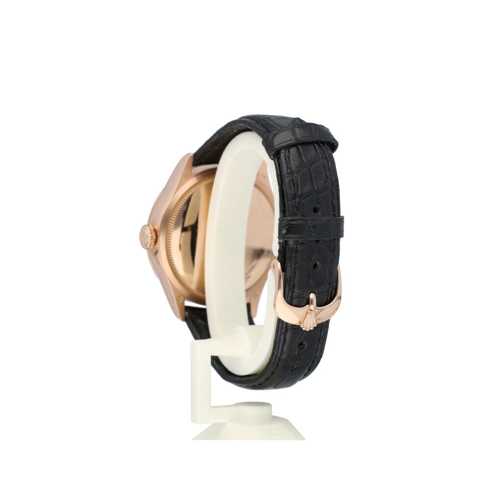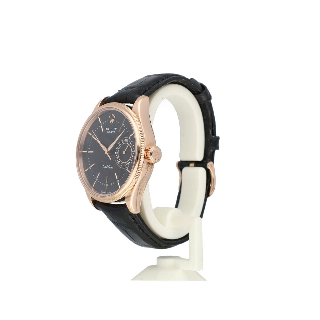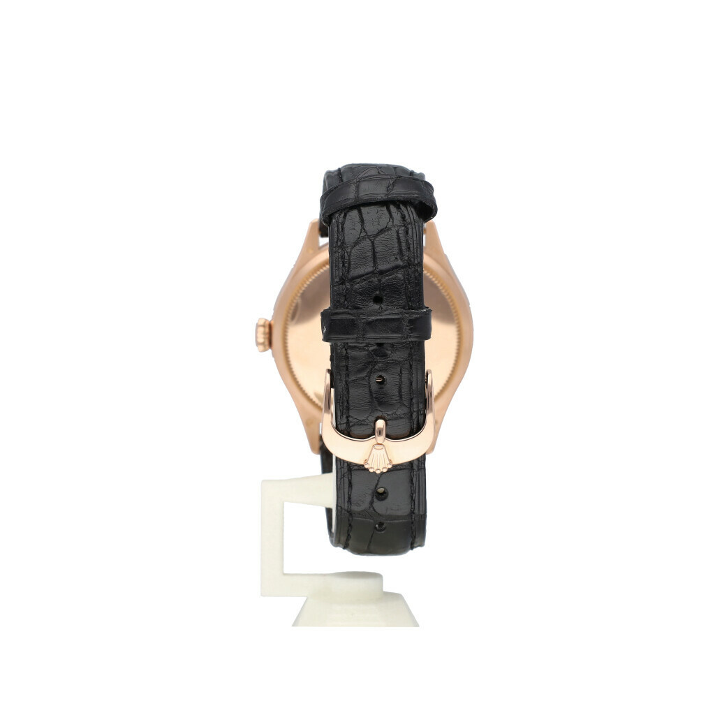 In very good condition Rolex Cellini Date in rose gold with black dial and black strap from 2017 complete with box and papers.