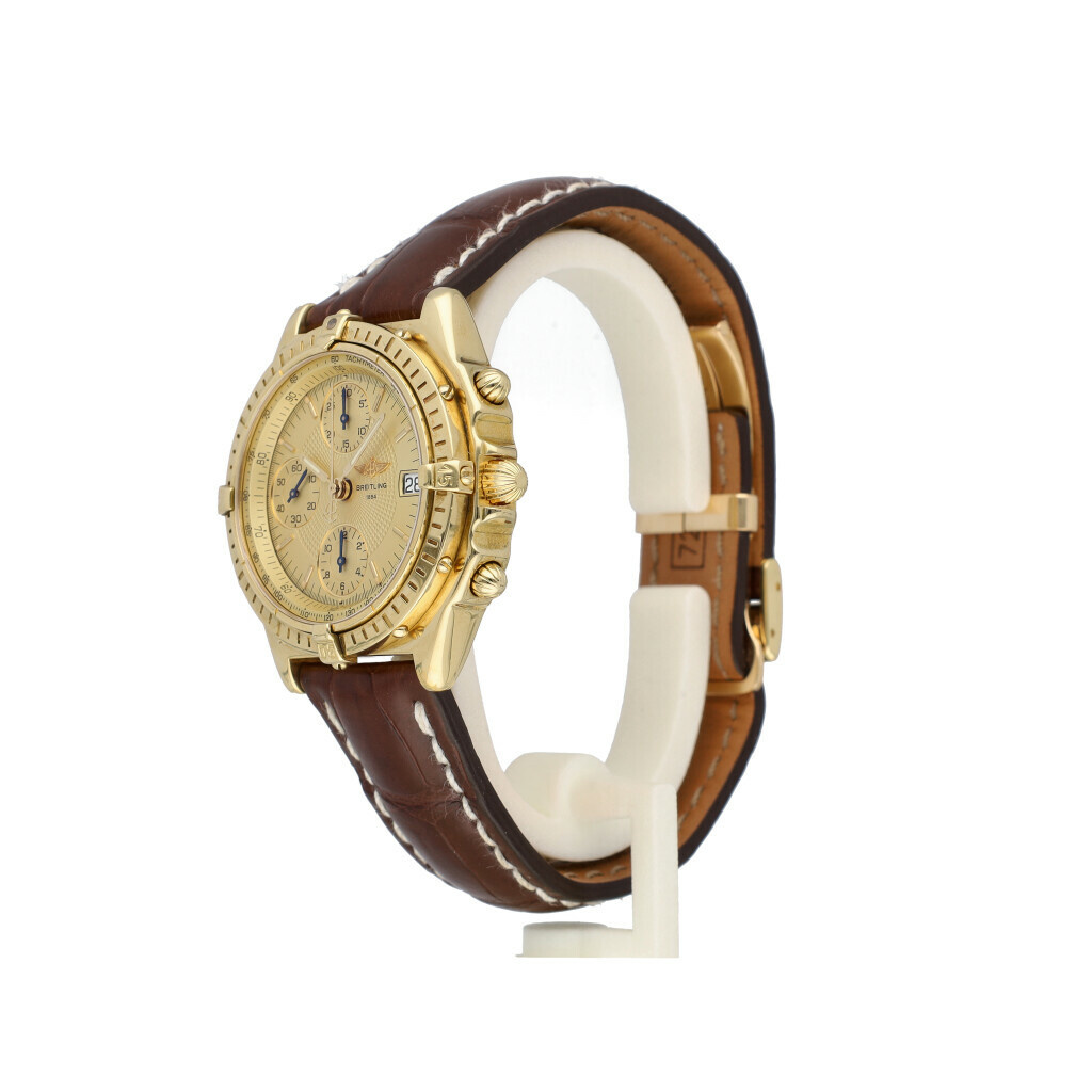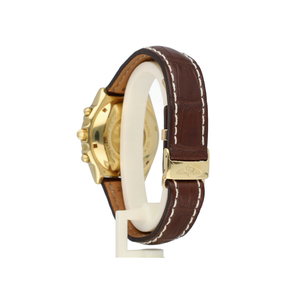 In very good condition Breitling Chronomat Chronograph in yellow gold with champagne dial and lbrand new brown Breitling strap from 1998 complete with box and papers.