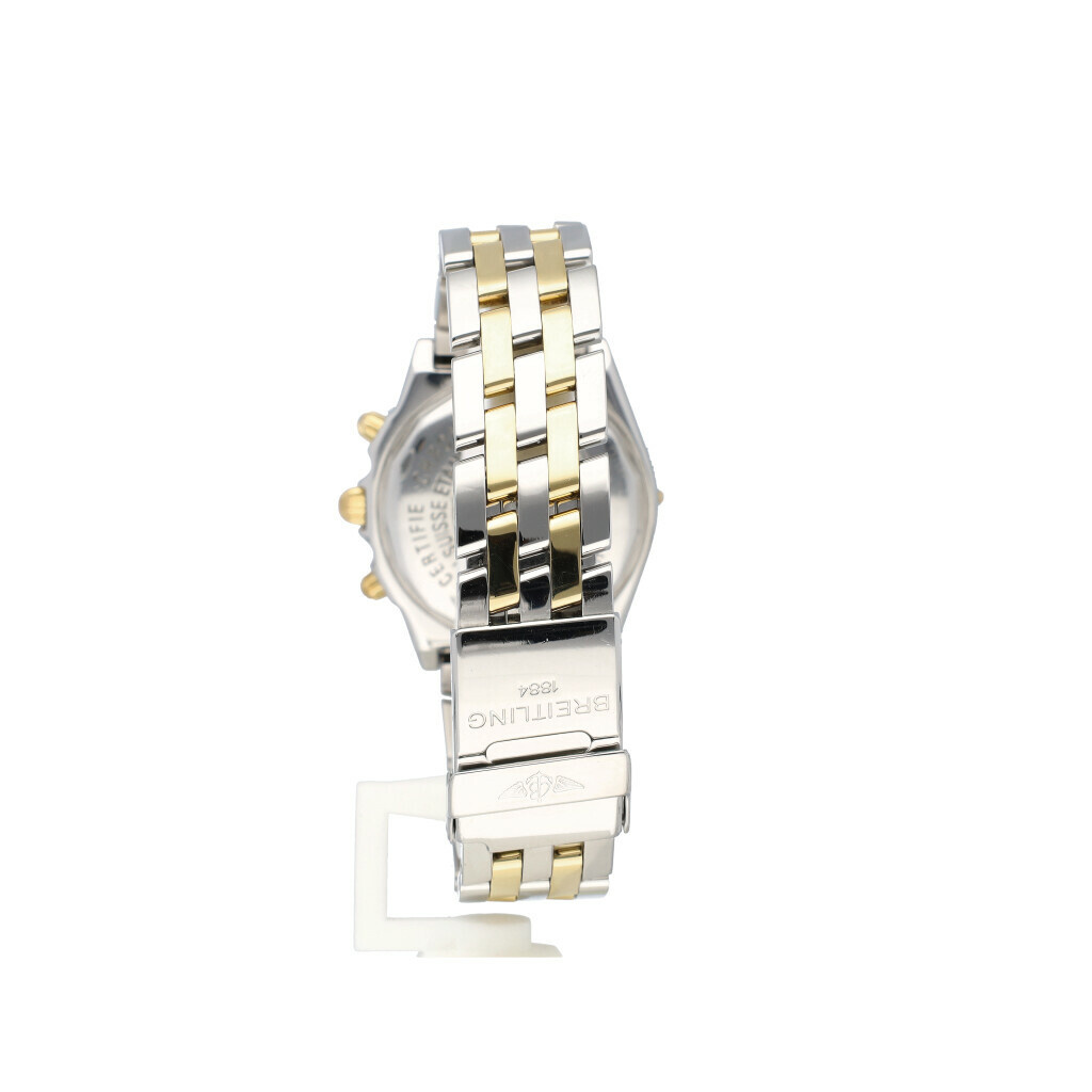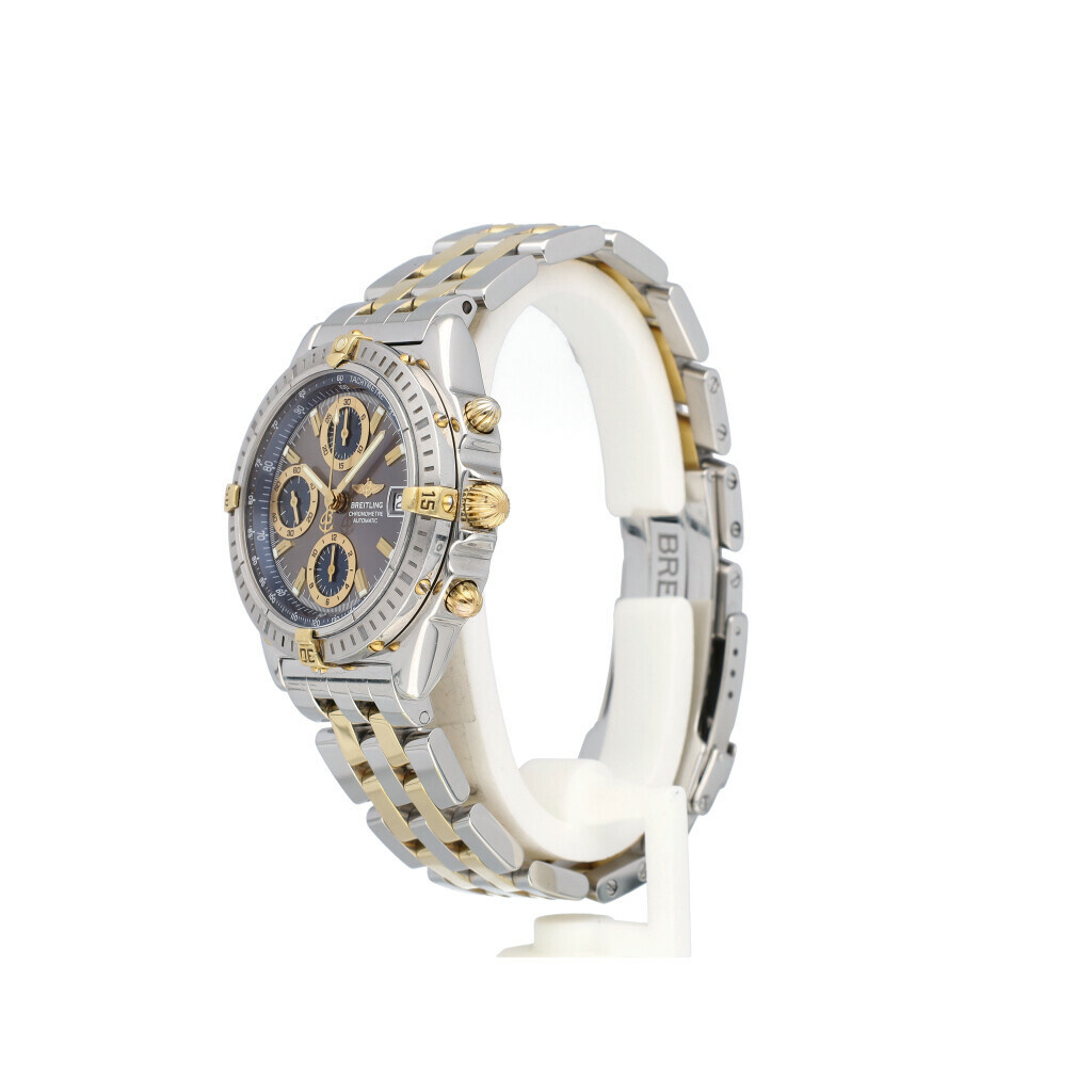 In very good condition Breitling Chronomat in yellow gold and steel with faded blue dial and steel gold bracelet from 2001 complete with box and papers.
