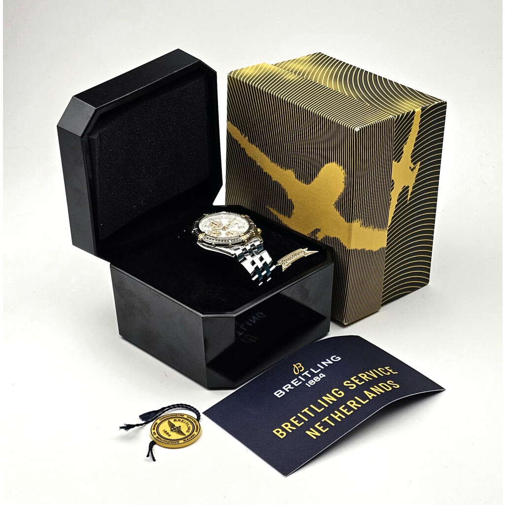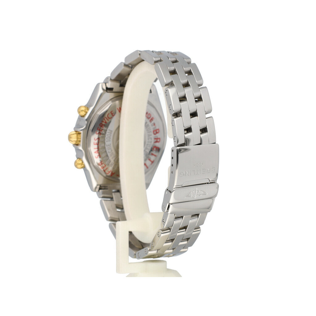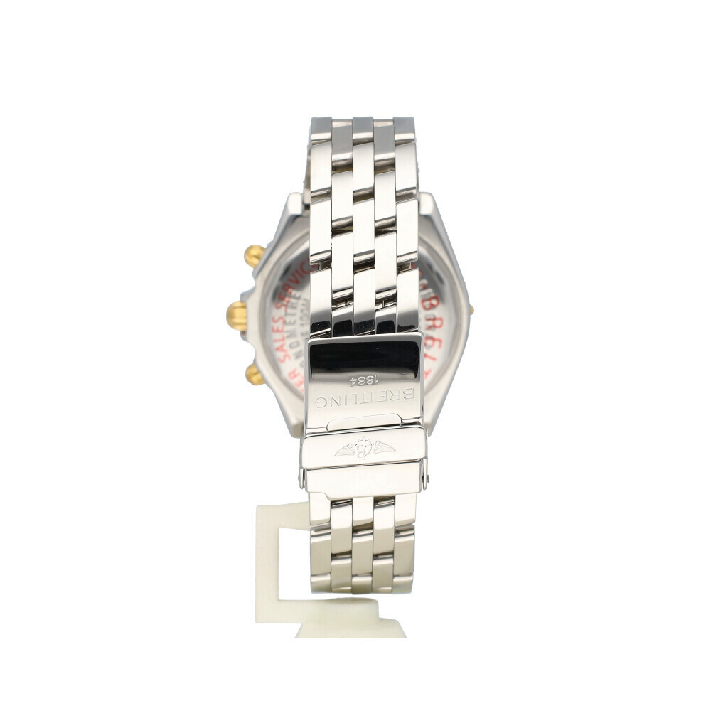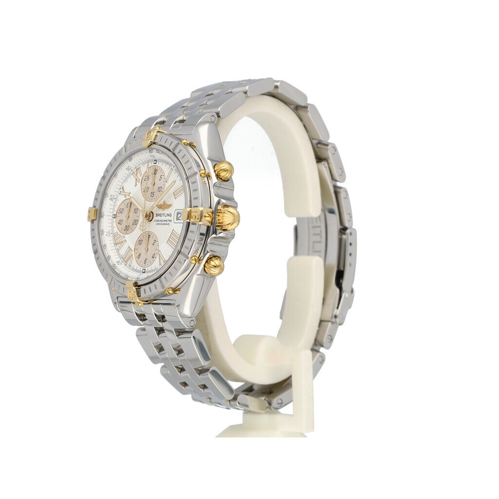 In very good condition Breitling Crosswind Racing in steel with white roman dial, yellow gold riders and steel bracelet complete with box, no papers. Breitling serviced 8-2025 and not worn since. Breitling service certificate included.