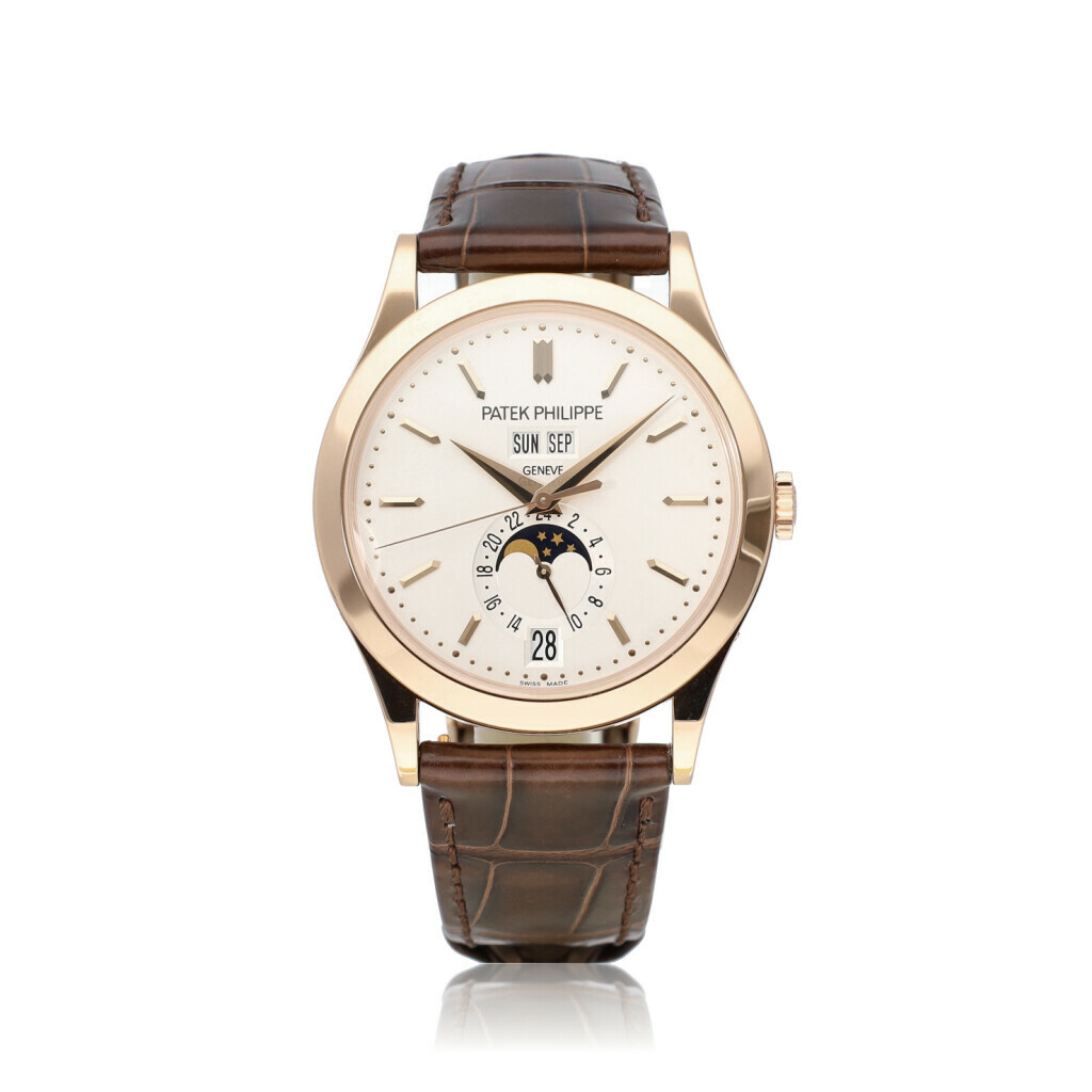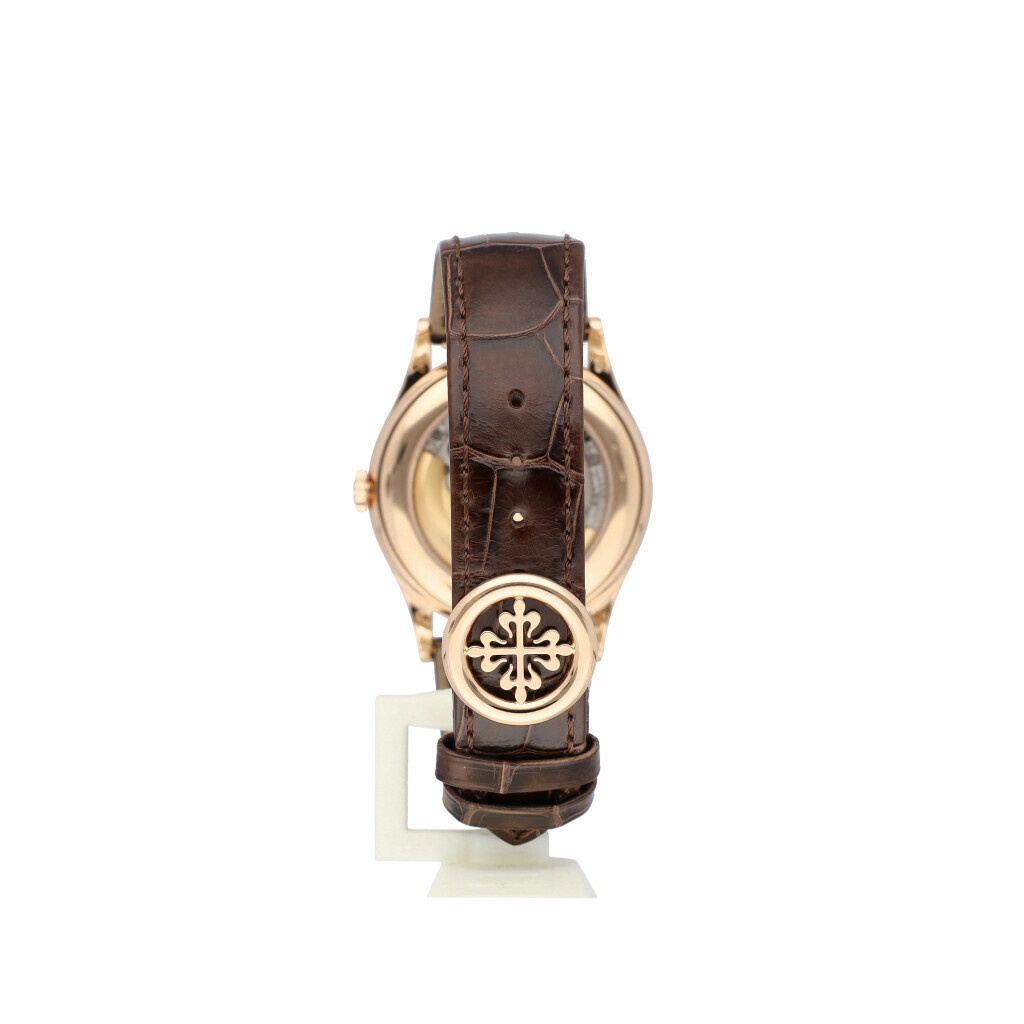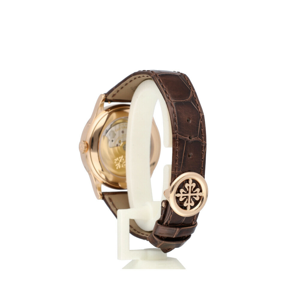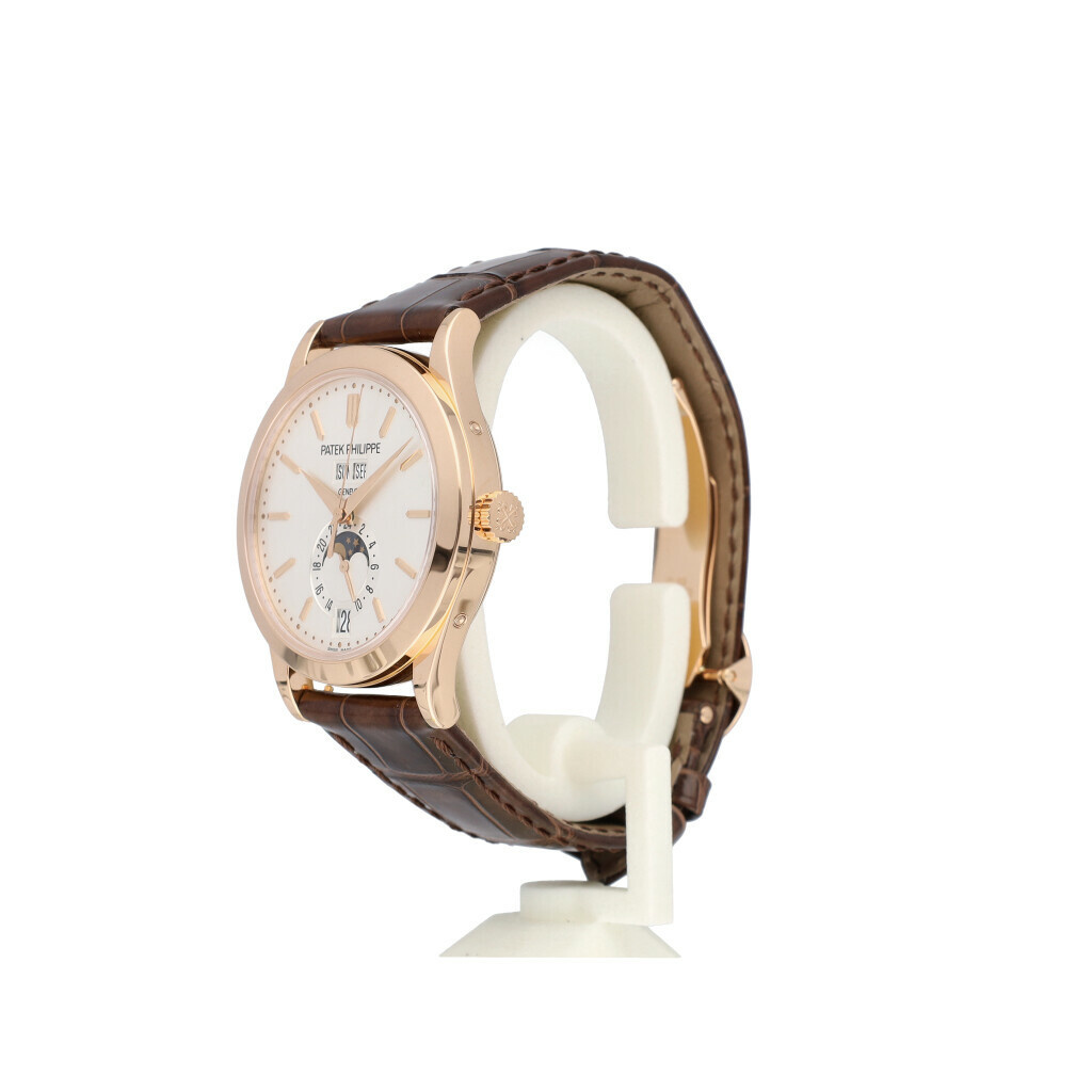 In perfect condition Patek Philippe Annual Calendar in rose gold with creme coloured dial, brand new brown Patek strap from 2016 complete with box and papers. Patek serviced including new Patek strap 10-2025 and not worn since. Patek service label included in sale.