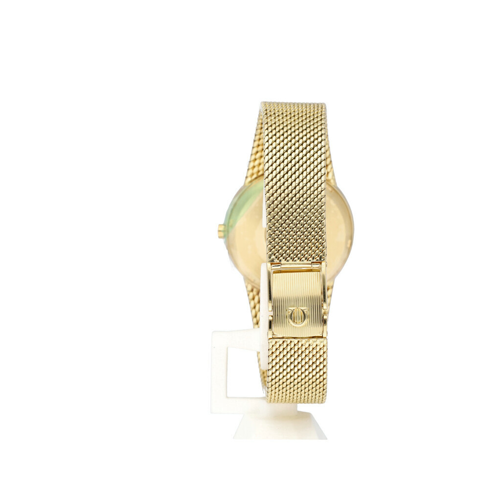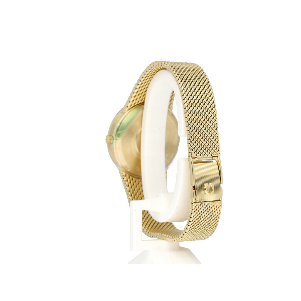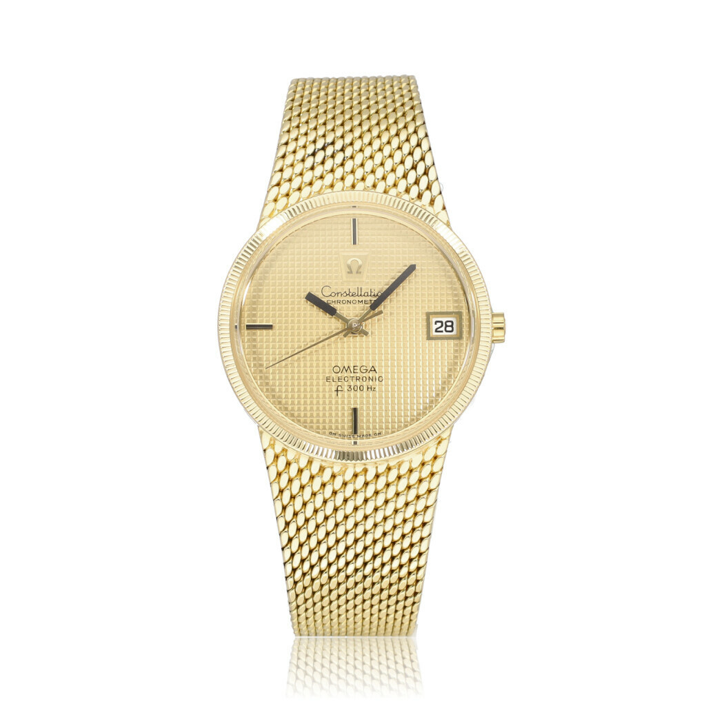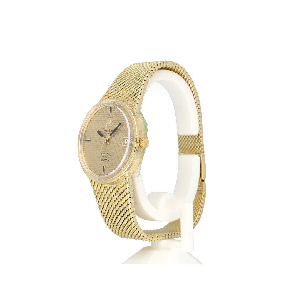 In very good condition Omega Consellation f300Hz Electronic Chronometer Tuningfork in gold with gold dial and rare mesh Omega bracelet. No box and/or papers. Omega serviced for € 1.950,- and not worn since. Omega service certificate included.