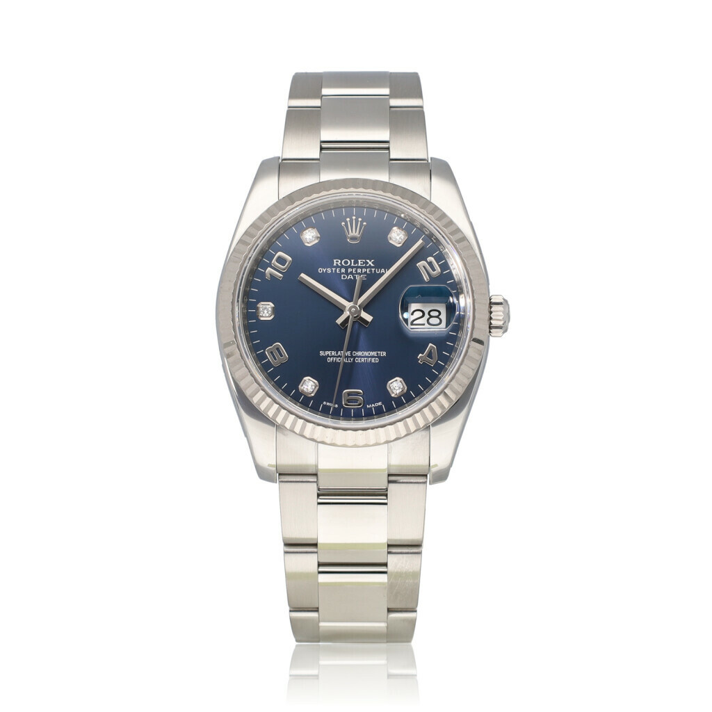 In very good condition Rolex Oyster Perpetual Date in steel and white gold with blue diamond dial and Oyster bracelet from 2014 complete with box and papers.