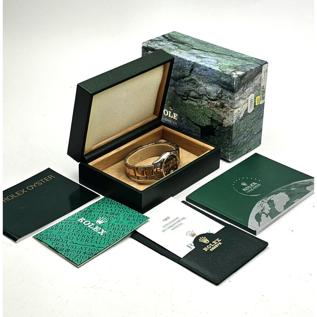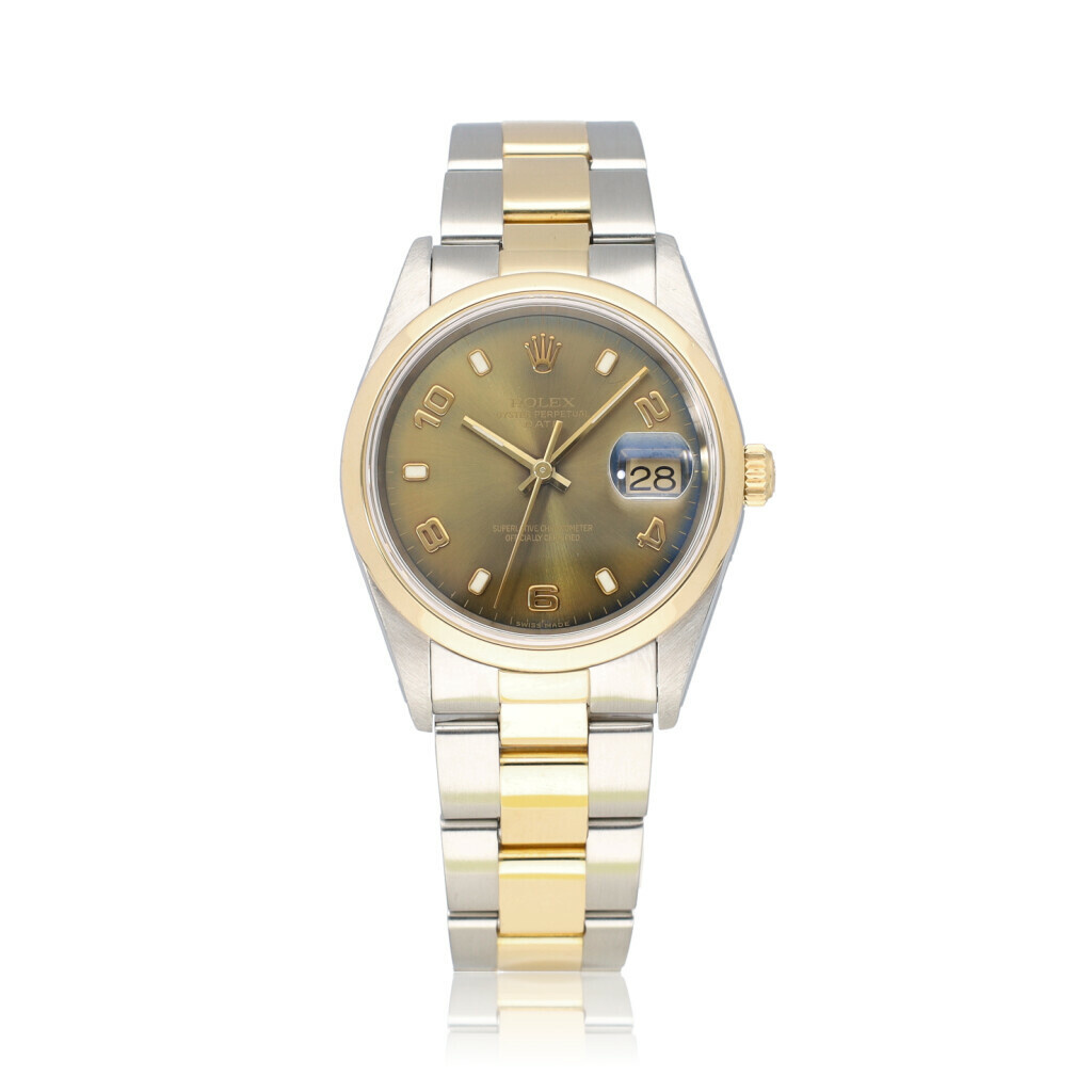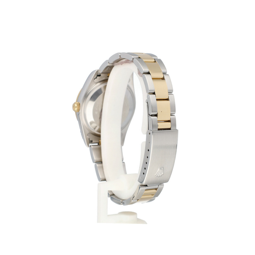 In very good condition Rolex Date 34 in steel and yellow gold with silver araic dial from 2003 complete with box and papers. Rolex serviced 3-2025 and not worn since. Rolex service certificate included.