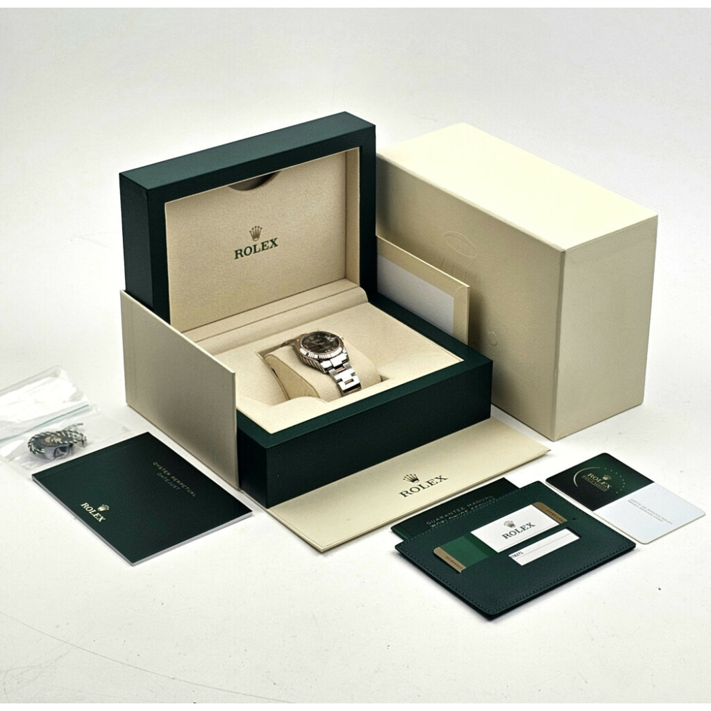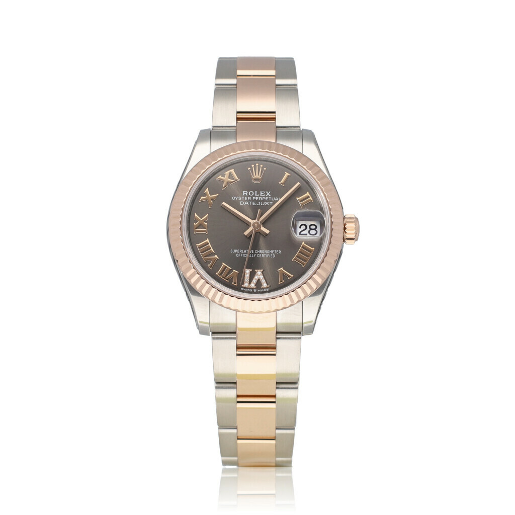 in very good condition Rolex Datejust in steel and rose gold with factory slate VI diamond dial and steel and rose gold Oyster bracelet from 2020 complete with box and papers. Rolex serviced 12-2025 and not worn since. Rolex service certificate included.