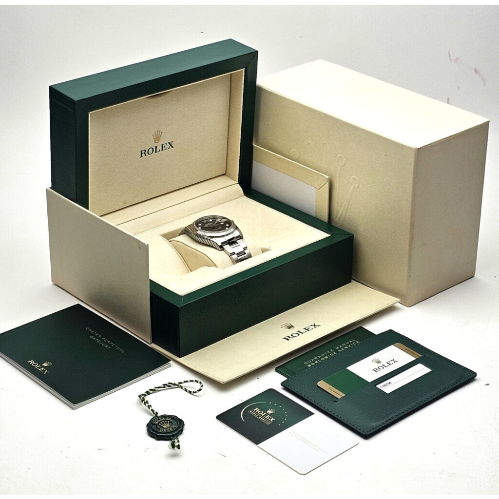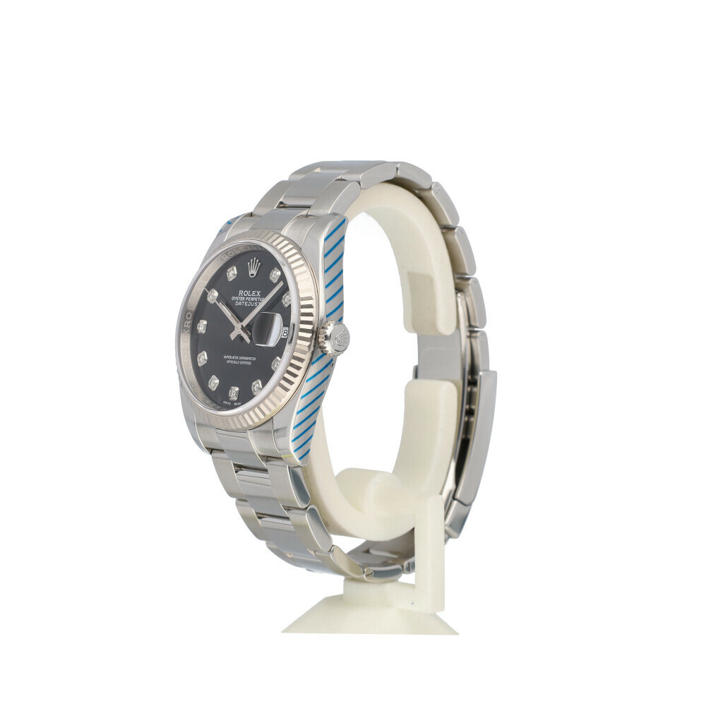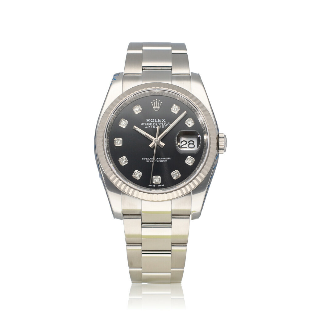 In very good condition Rolex Datejust 36 in steel and white gold with factory black diamond dial and steel Oyster bracelet from 2016 complete with box and papers. Rolex serviced 2-2026 and not worn since. Rolex service certificate included.