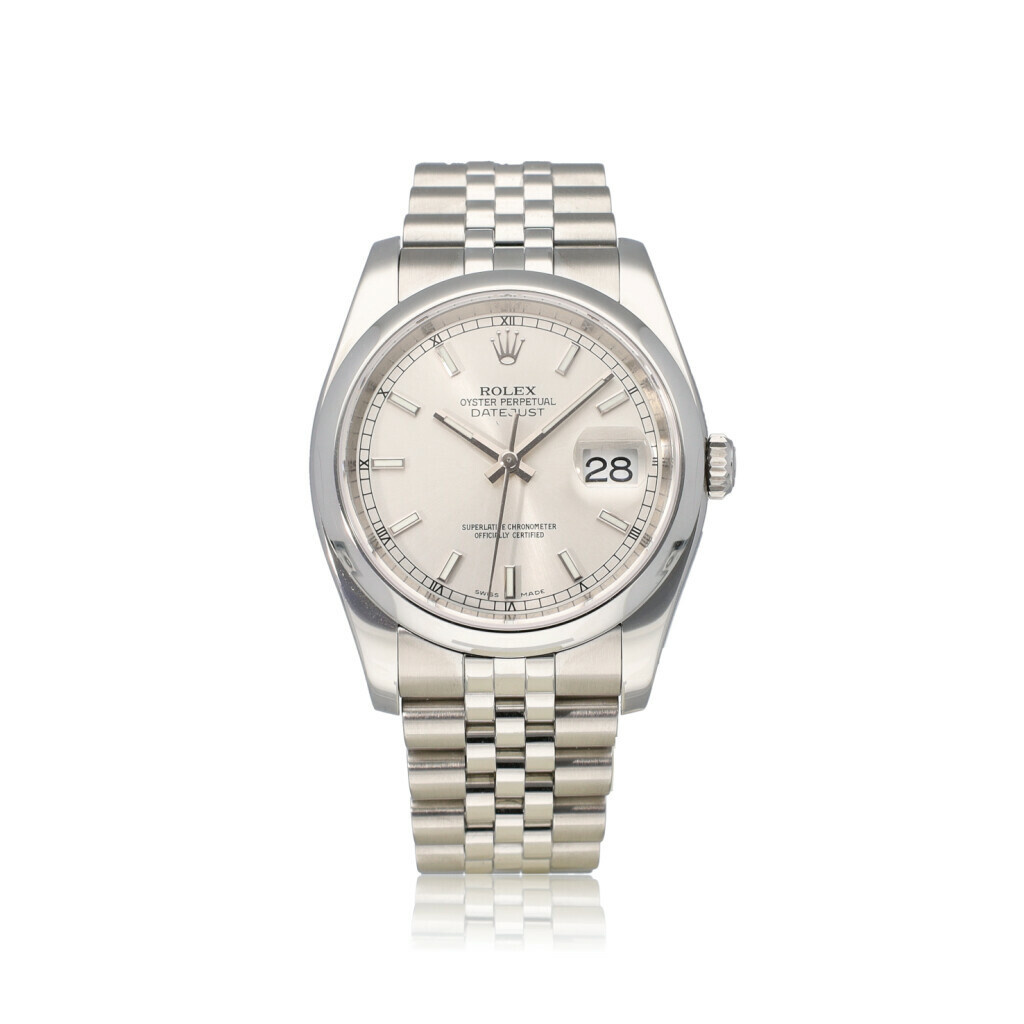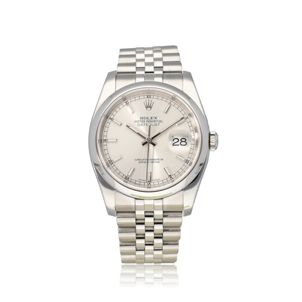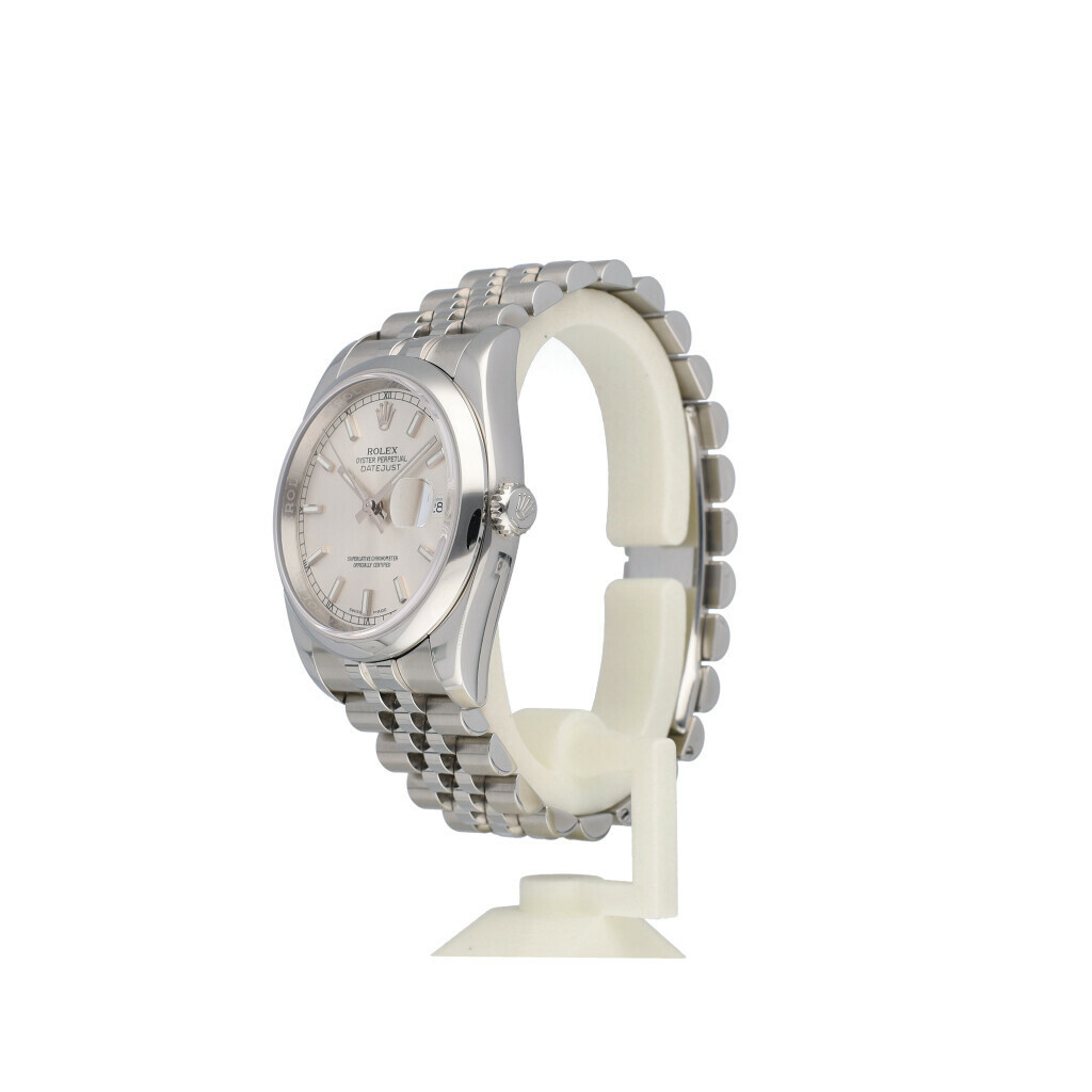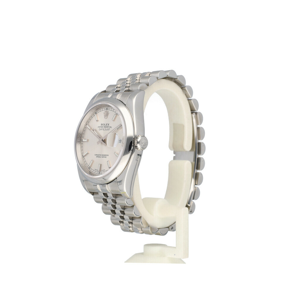 In very good condition Rolex Datejust 36 in steel with silver index dial, domed steel bezel and steel Jubilee bracelet from 2018 complete with box and papers. Rolex serviced 1-2026 and not worn since. Rolex service certificate included.