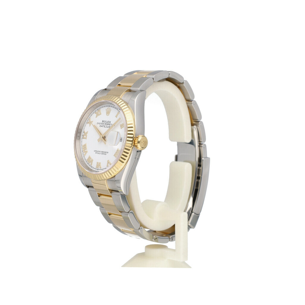 In very good condition Rolex Datejust 36 in steel yellow gold with white roman dial and Oyster bracelet from 2020 complete with box and papers. Rolex serviced 3-2026 and not worn since. Rolex service certificate included.