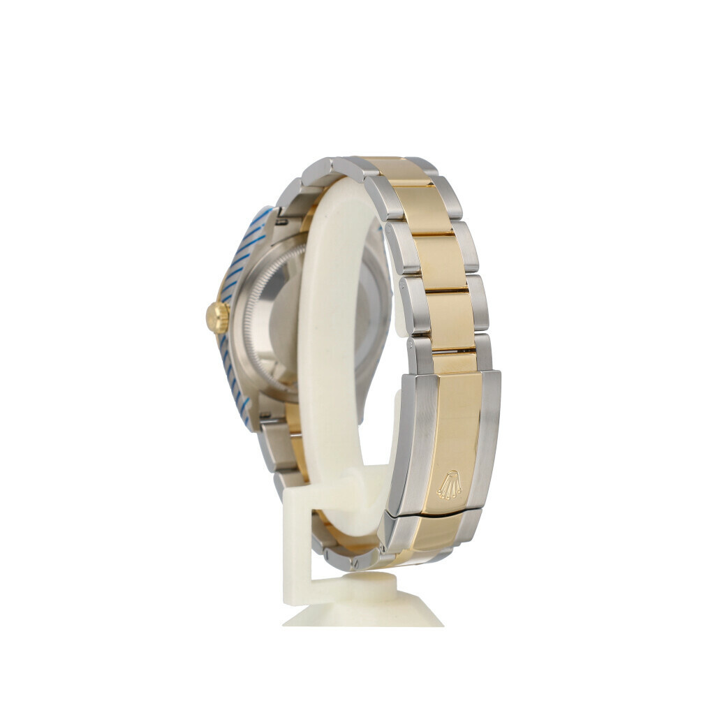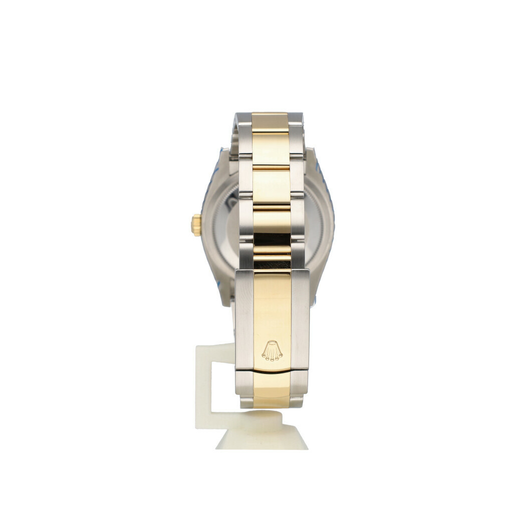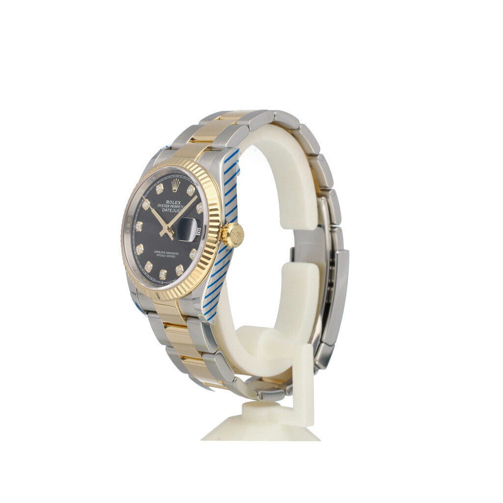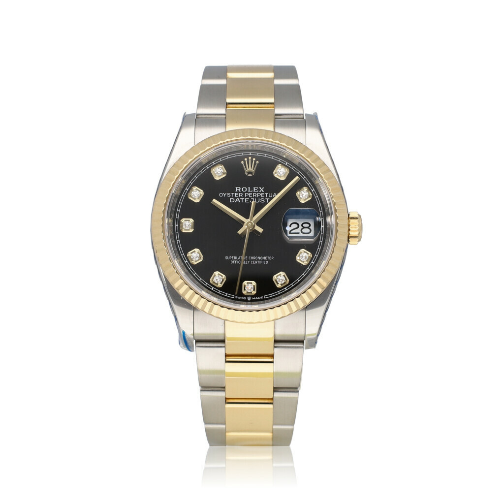In very good condition Rolex Datejust 36 in steel and yellow gold with factory black diamond dial, yellow godl fluted bezel and steel and yellow gold Oyster bracelet from 2019 complete with box and papers. Rolex serviced 11-2025 and not worn since. Rolex service certificate included.