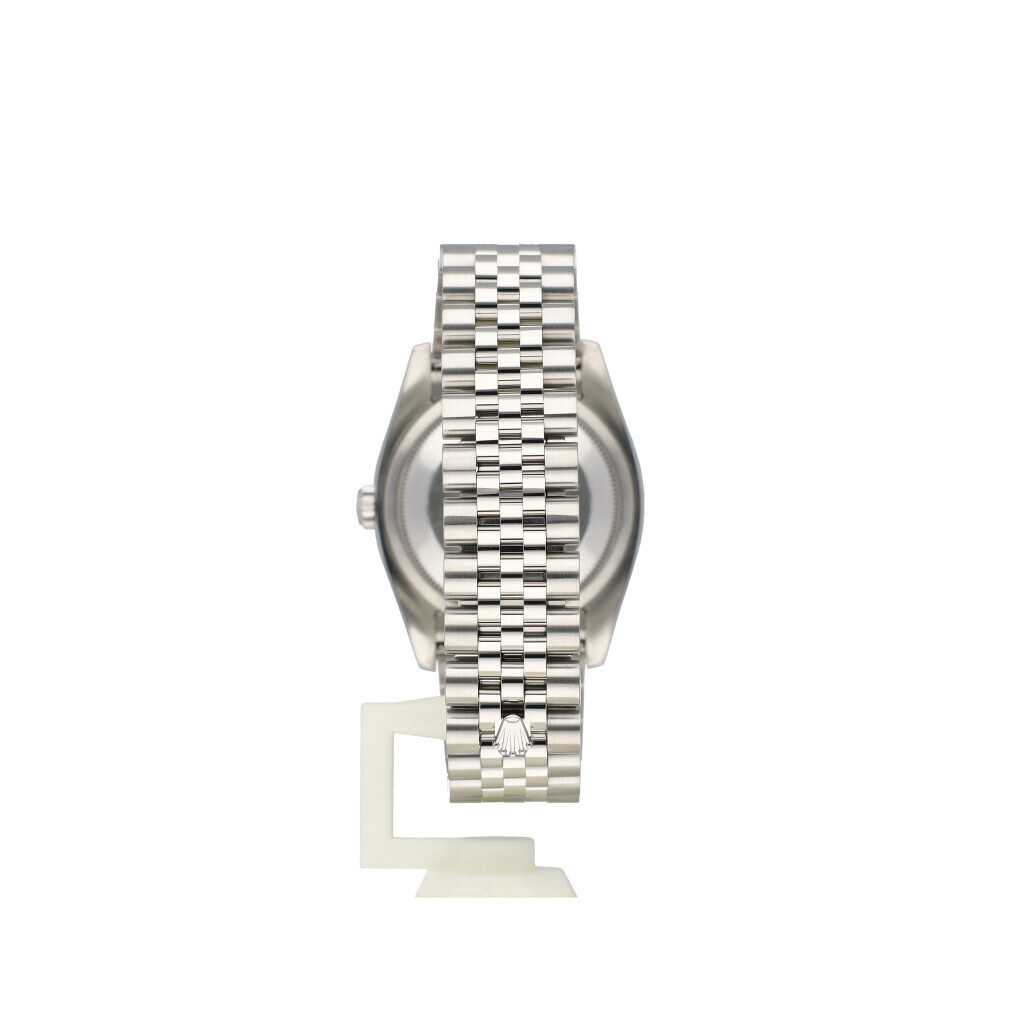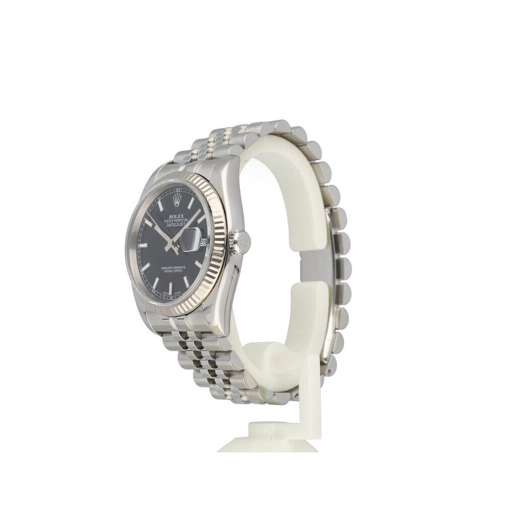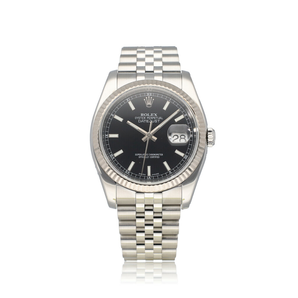 In very good condition Rolex Datejust in steel and white gold with black dial, roulette black and red date, white gold fluted bezel and steel concealed Jubilee bracelet from +/- 2005 (D047... serial). No box and/or papers.