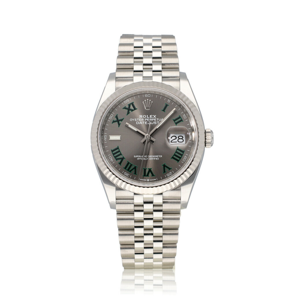 In very good condition Rolex Datejust 36 in steel and white gold with so called wimbledon dial, white gold fluted bezel and steel Jubilee bracelet from 2021 complete with box and papers.