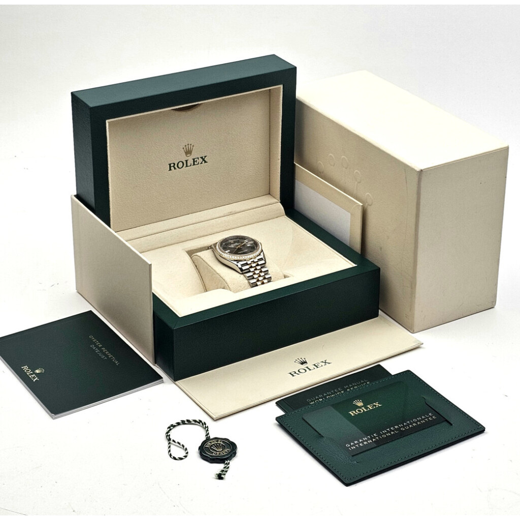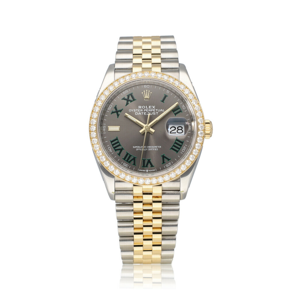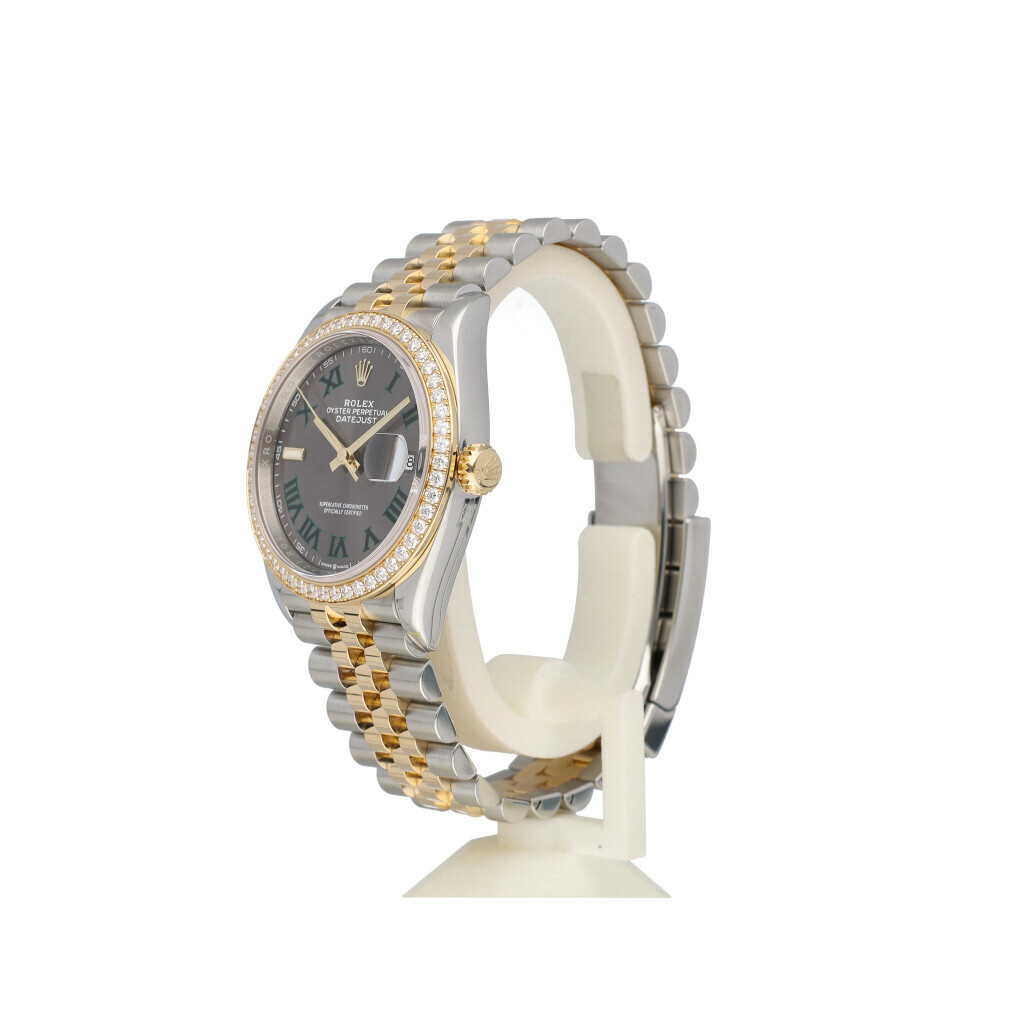 In very good condition Rolex Datejust in steel - yellow gold with so called "Wimbledon" grey dial - factory set diamond bezel and steel and yellow gold Jubilee bracelet from 2021 complete with box and papers.