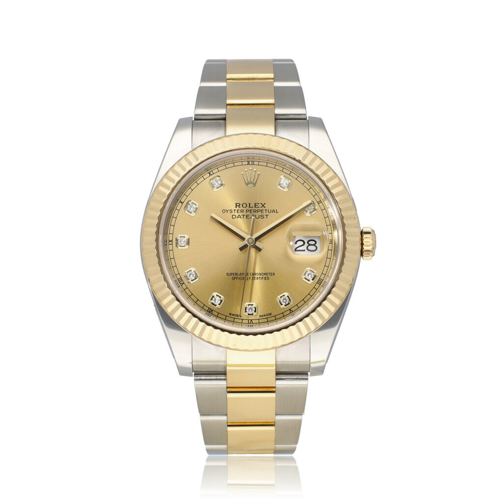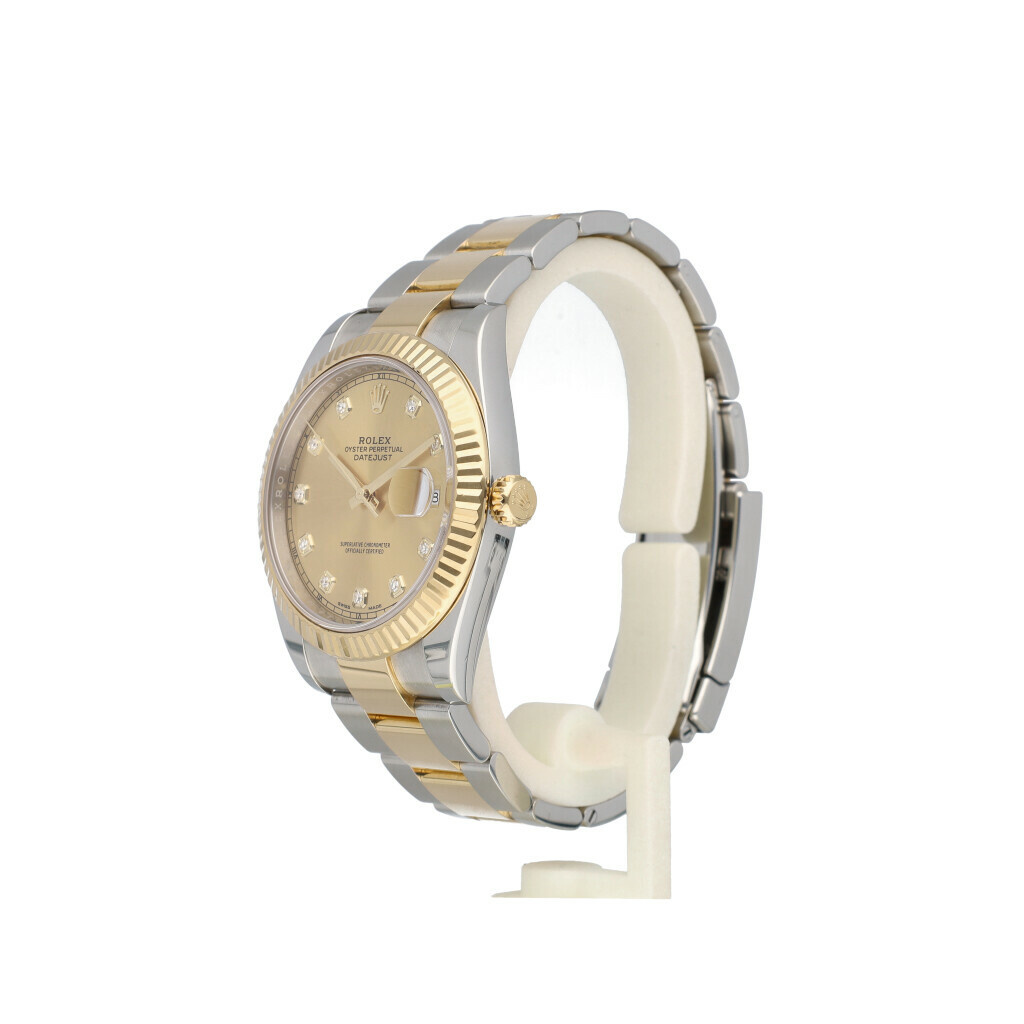In very good condition, Rolex Datejust 41 in steel and yellow gold with champagne diamond dial and Oyster bracelet from 2018 complete with box and papers.