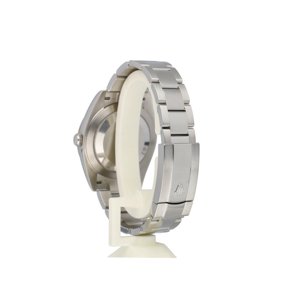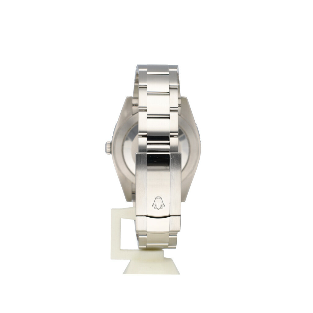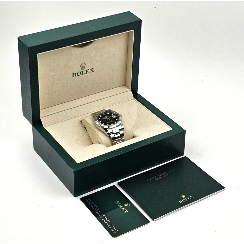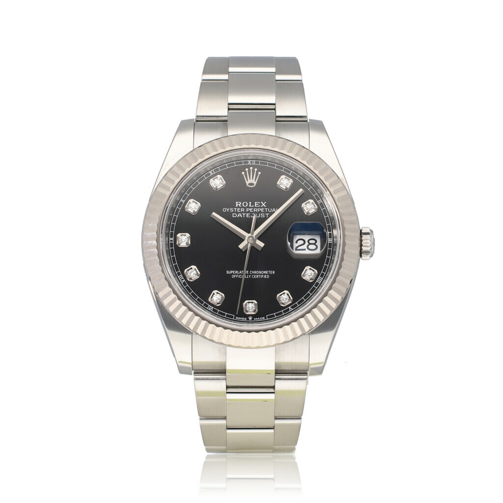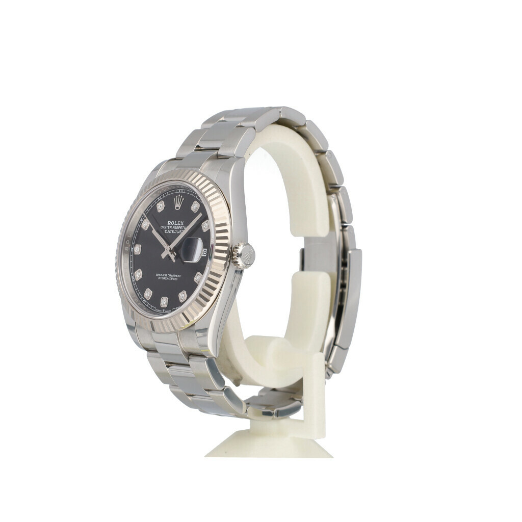 In very good condition Rolex Datejust 41 in steel and white gold with factory black diamond dial, white gold fluted bezel and steel Oyster bracelet from 2024 complete with box and papers.