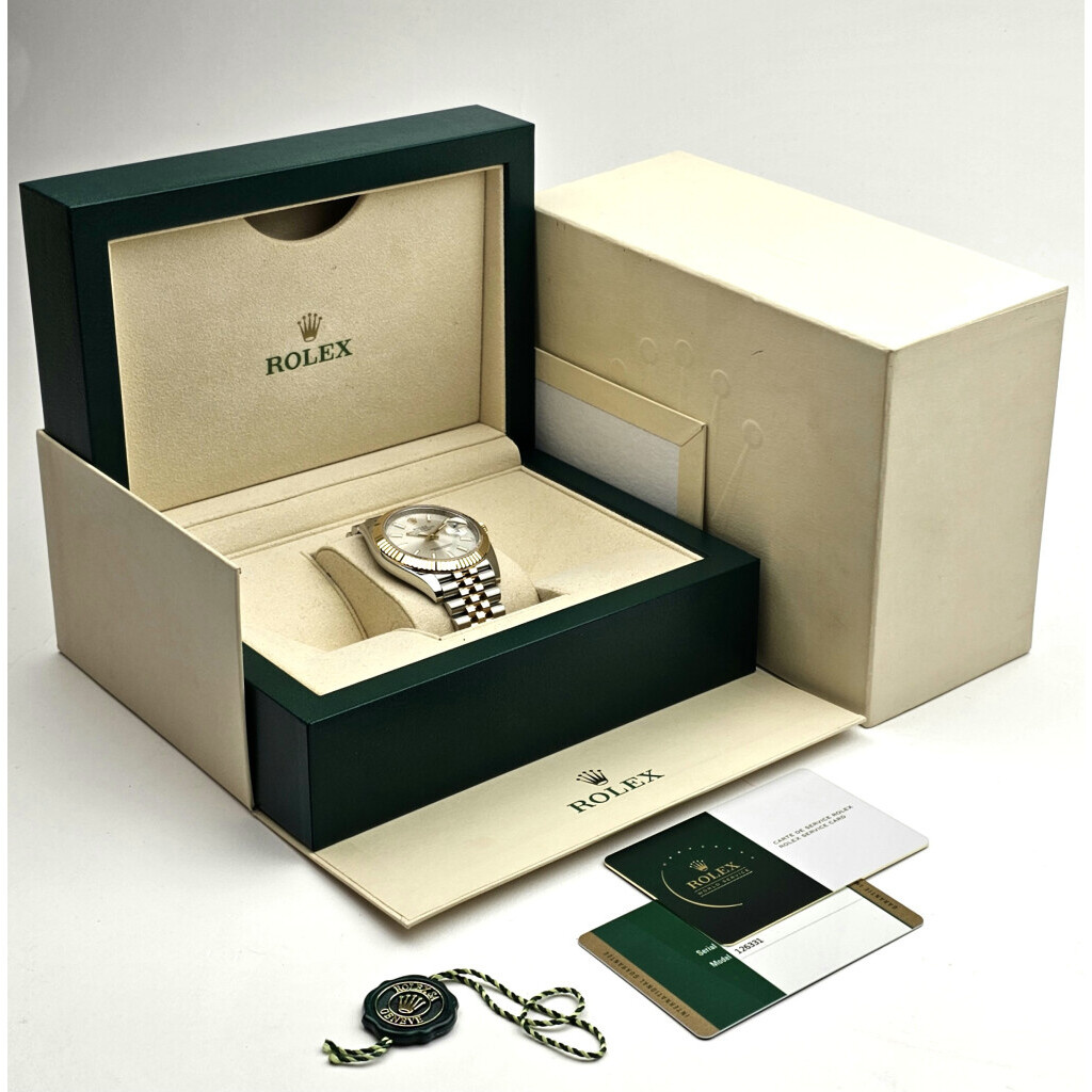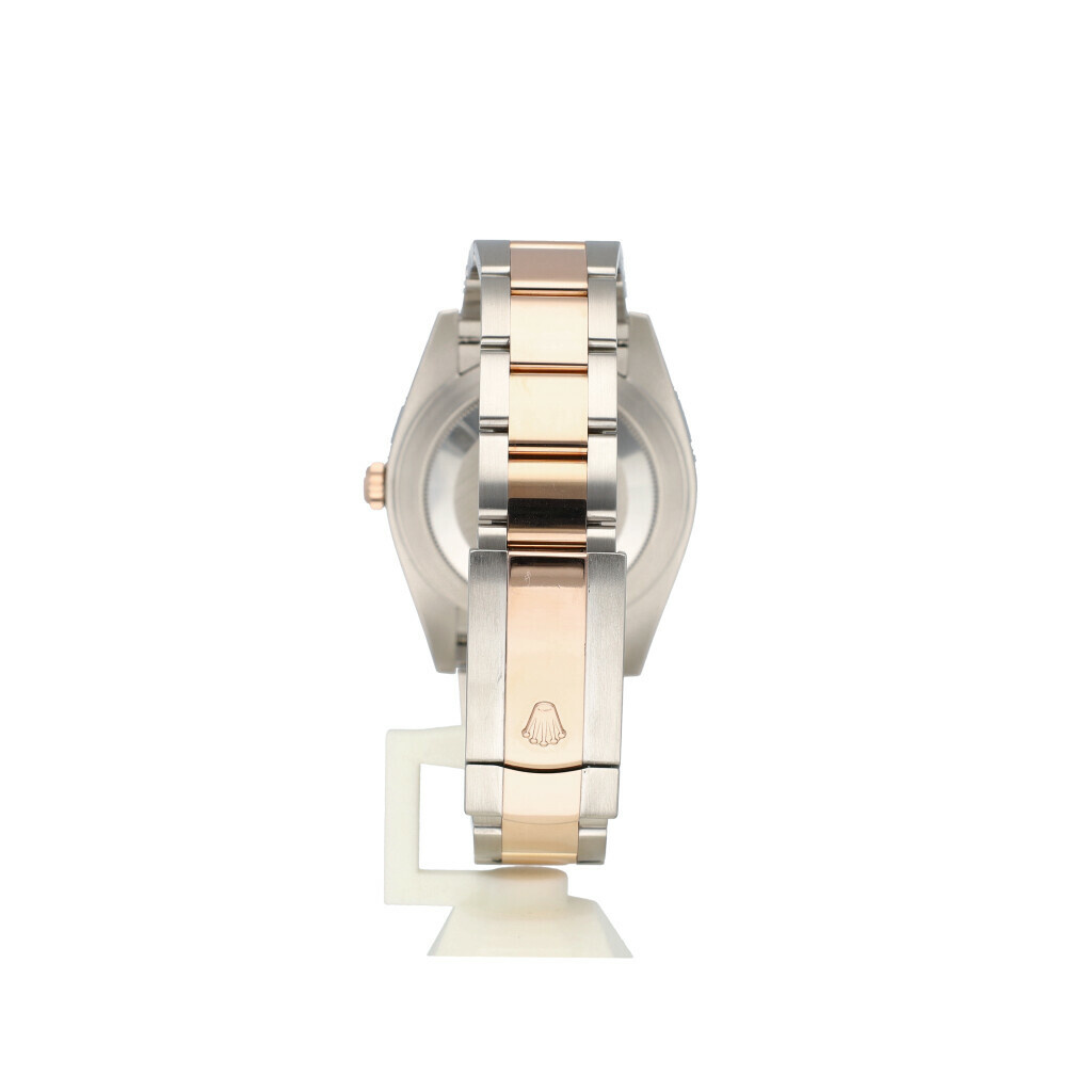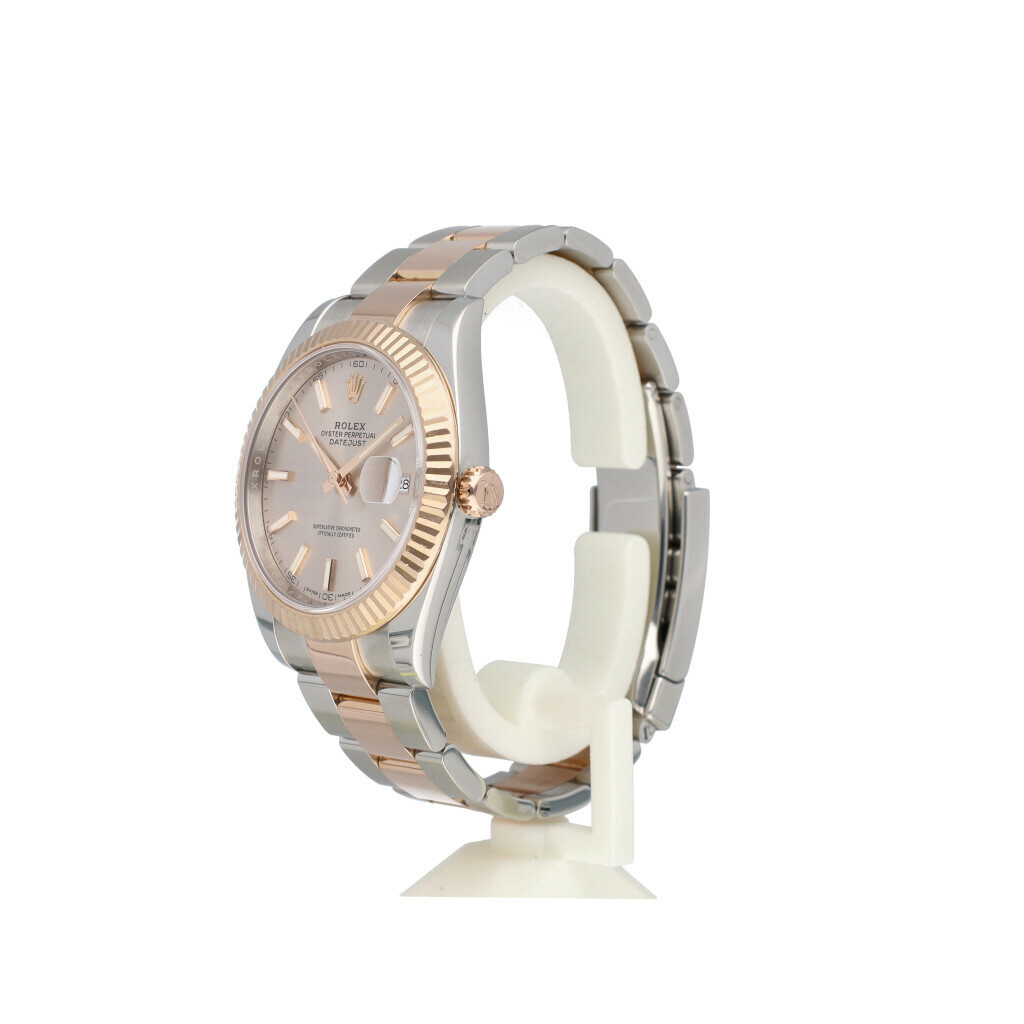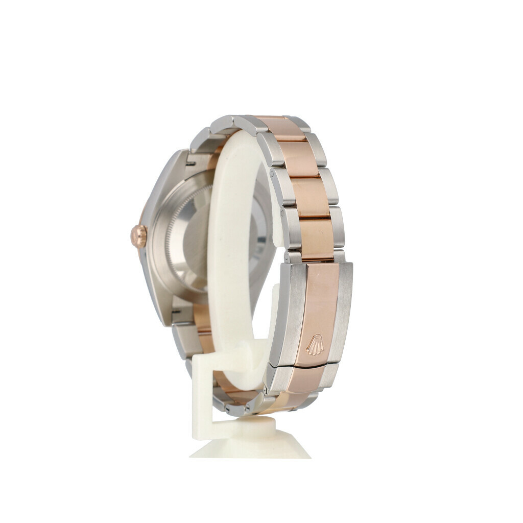 In very good condition Rolex Datejust 41 in steel and rose gold with sundust dial, rose gold fluted bezel and steel and rose gold Oyster bracelet from 2017 complete with box and papers. Rolex serviced 7-2025 and not worn since. Rolex service certificate included.