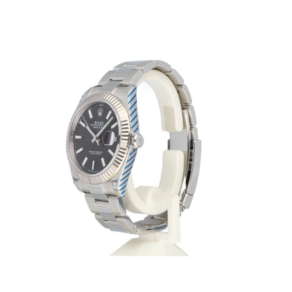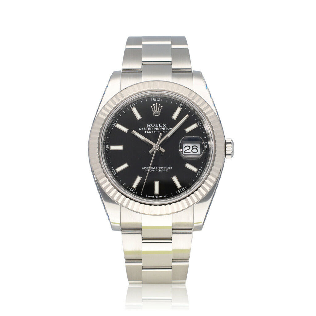 In very good condition Rolex Datejust 41 in steel and white gold with black dial, white gold bezel and steel Oyster bracelet from 2019 complete with box and papers. Rolex serviced 7-2025 and not worn since. Rolex service certificate included.