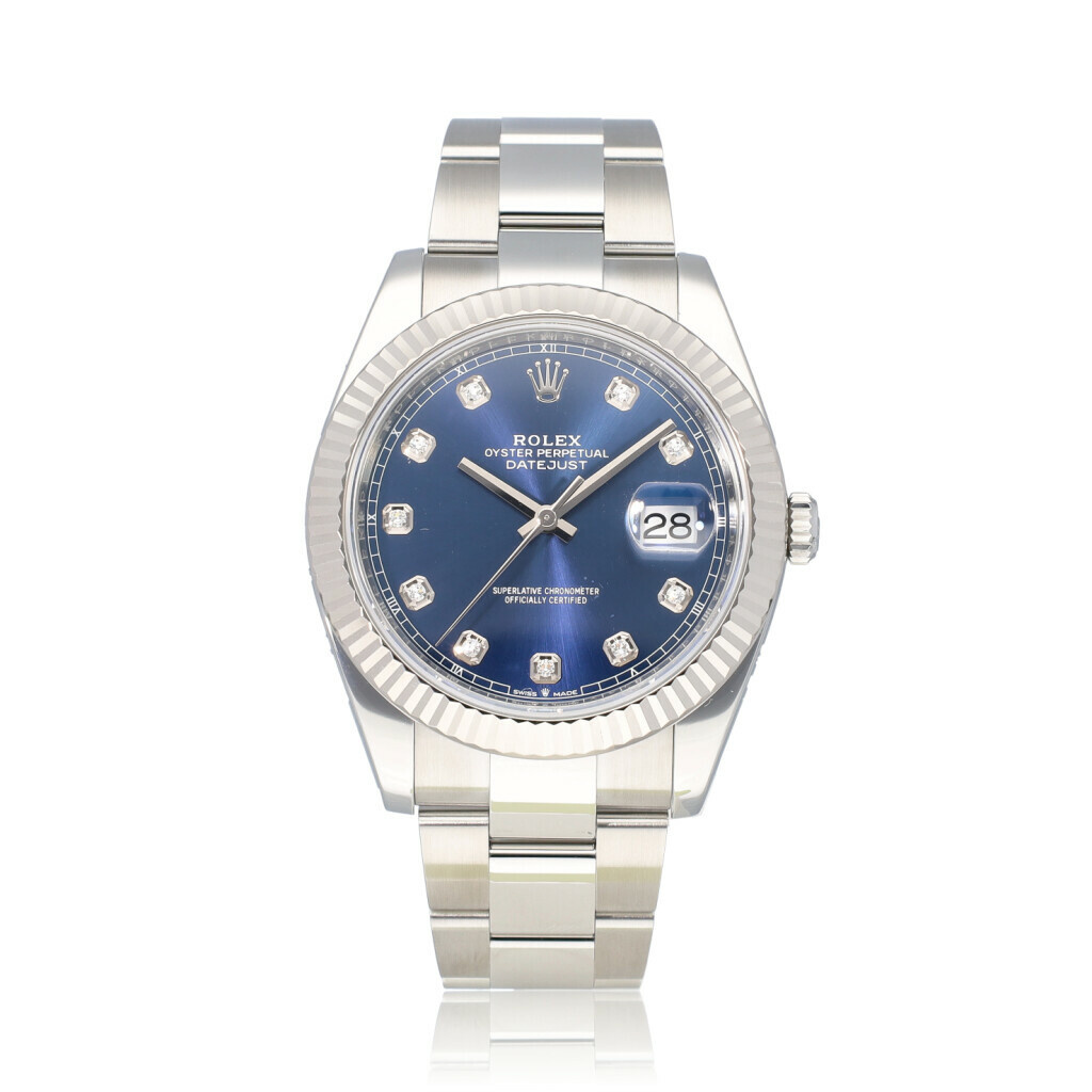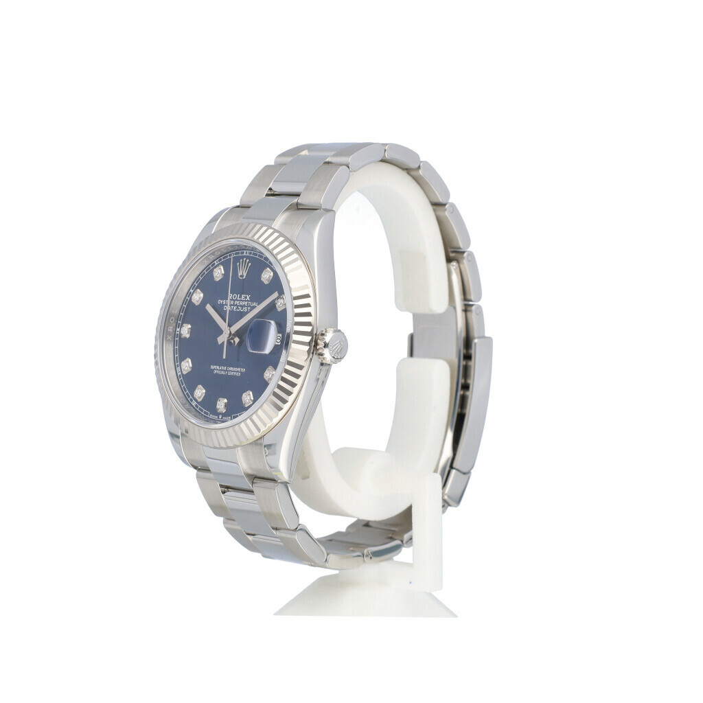 In very good condition Rolex Datejust 41 in steel with blue factory diamond dial and Oyster bracelet from 2020 complete wtih box and papers, no box. Rolex serviced 12-2024 and not worn since. Rolex service certificate included.