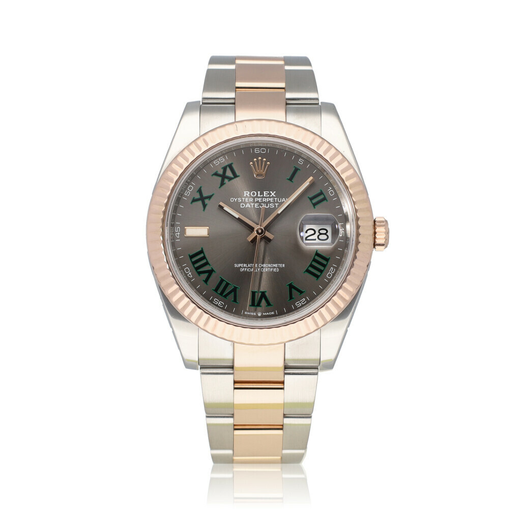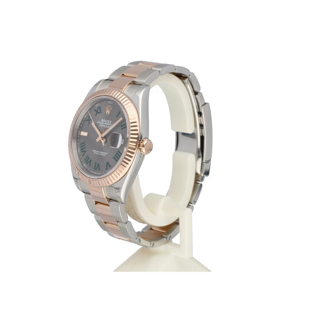 In very good condition Rolex Datejust 41 in steel and rose gold with grey so called 'Wimbledon' dial, rose gold fluted bezel and steel and rose gold Oyster bracelet from 2019 complete with box and papers.