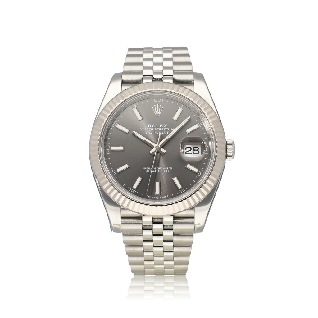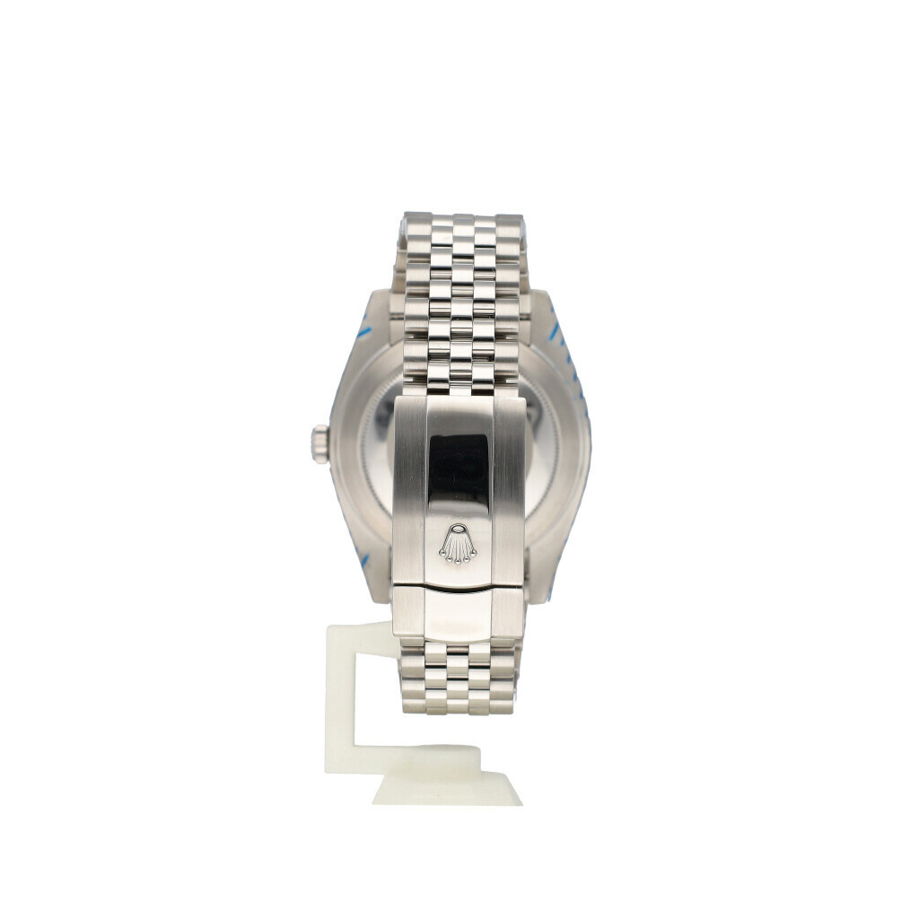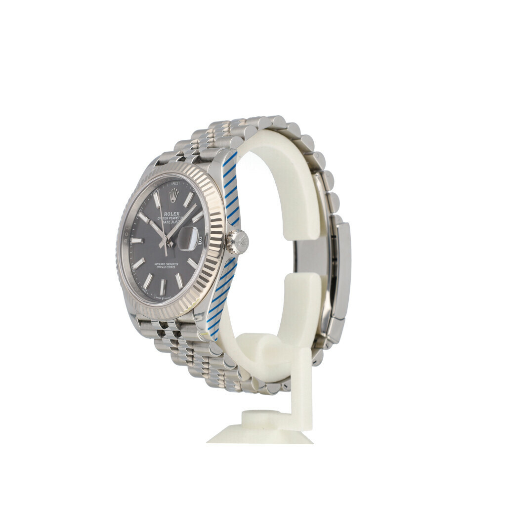 In very good condtion Rolex Datejust 41 in steel with rhodium / slate / grey dial, white gold bezel and Jubilee bracelet from 2019 complete with box and papers. Rolex serviced 10-2025 and not worn since. Rolex service certificate included.