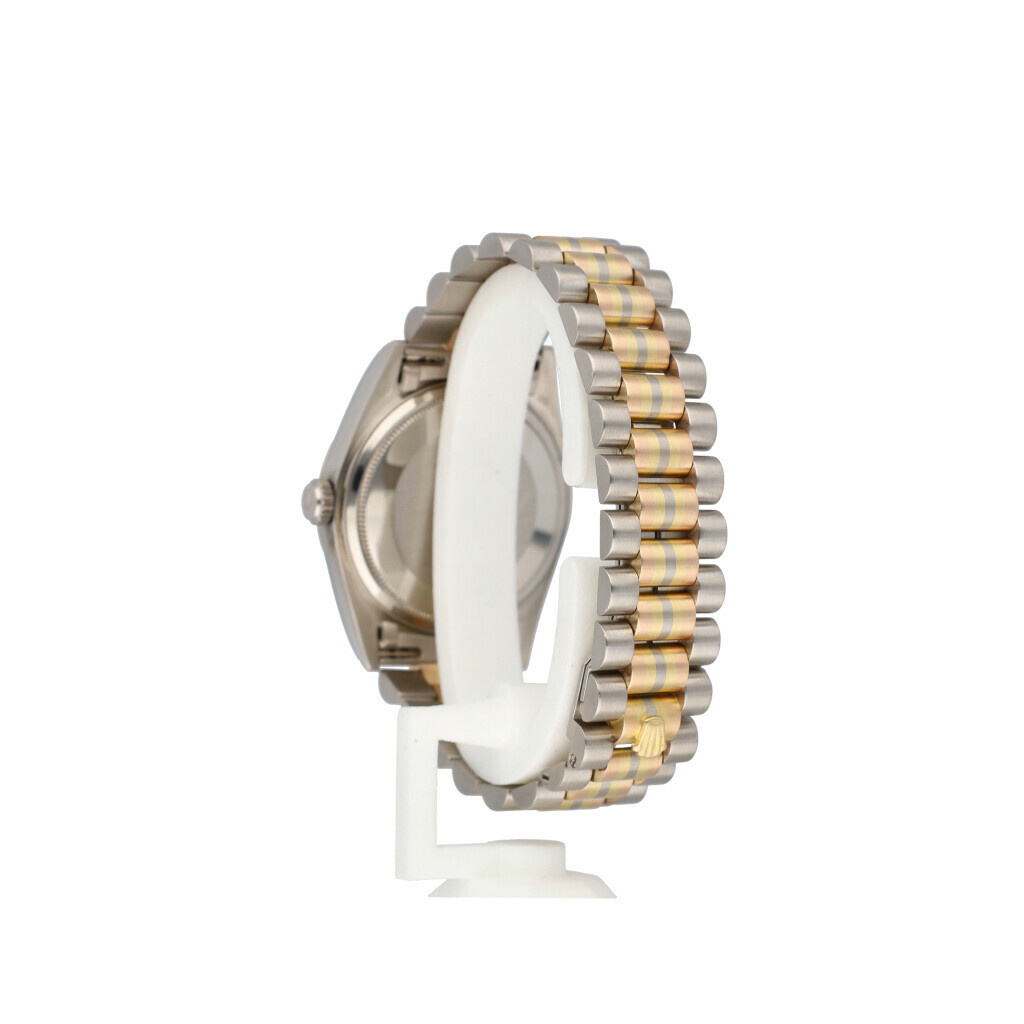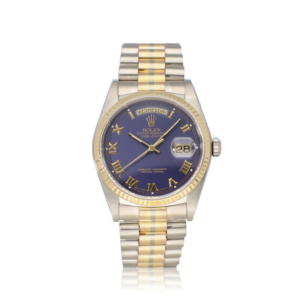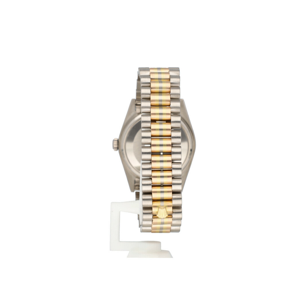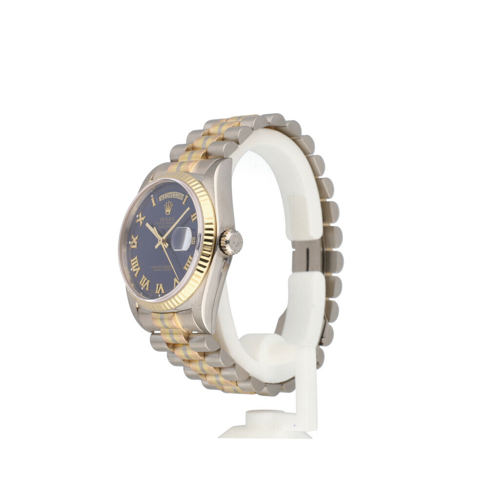 In very good condition Rolex Day-Date Tridor 36 in white, yellow and rose gold with blue roman dial and President bracelet from +/- 1987 (9586... serial). No box and/or papers.