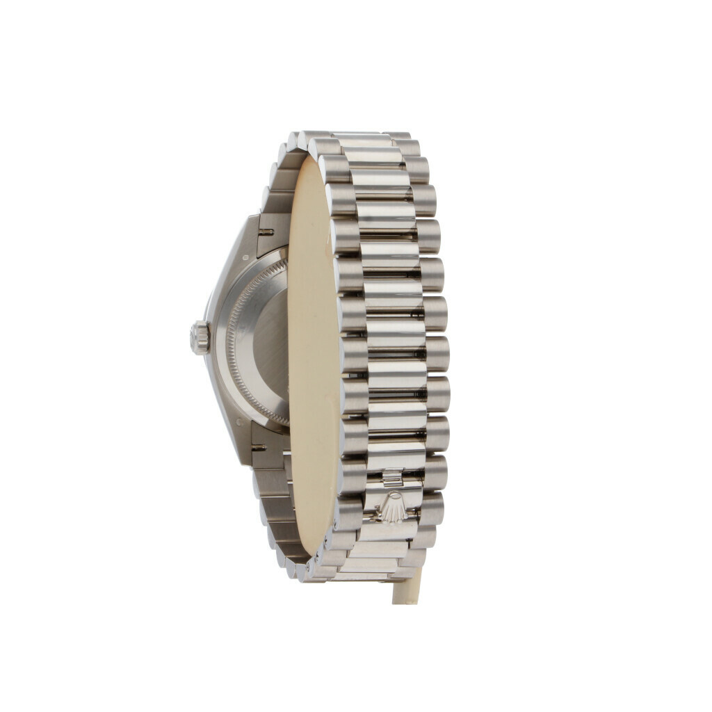 Unworn Rolex Day-Date in white gold with silver dial, factory diamond bezel and President bracelet. No box an/or papers.