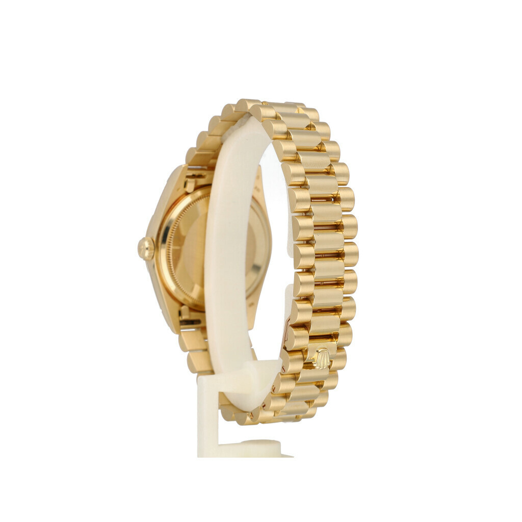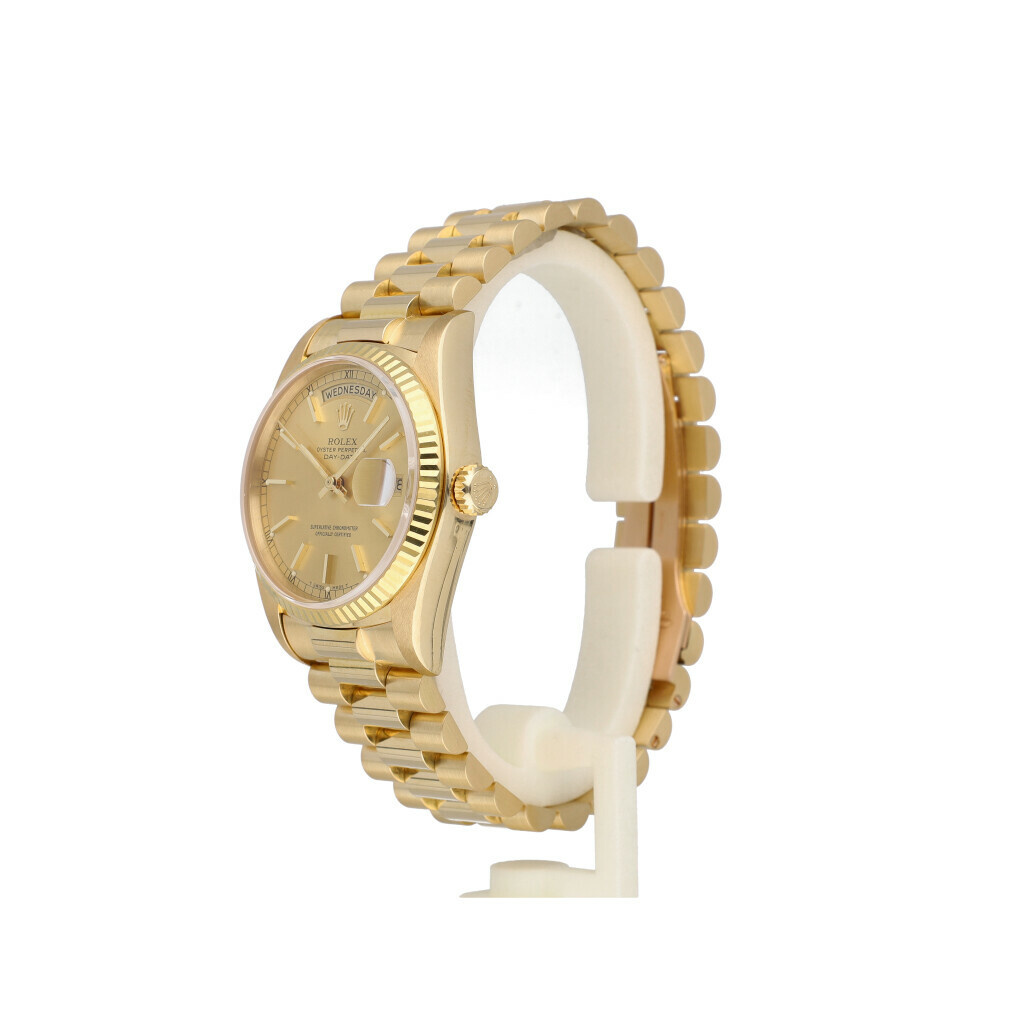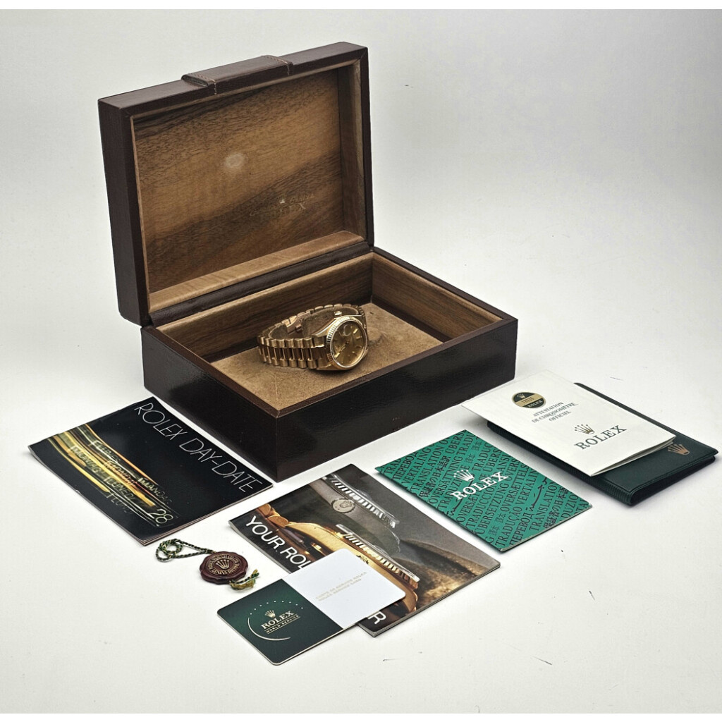 In very good condition Rolex Day-Date in yellow gold with champagne dial and tight President bracelet from 1985 complete with box and papers. Rolex serviced 1-2026 and not worn since. Rolex service certificate included.