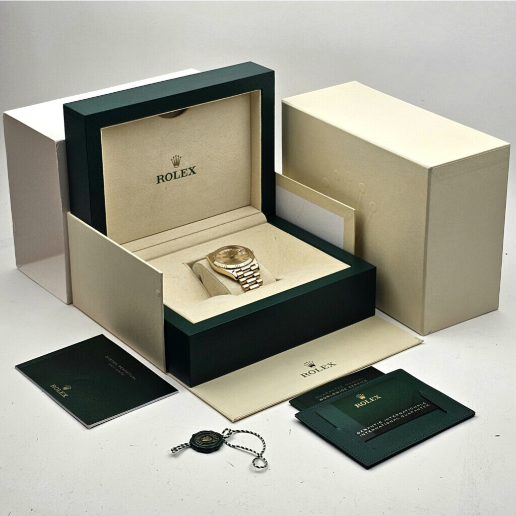 In very condition Rolex Day-Date 40mm in yellow gold with champagne dial and President bracelet from 2020 complete with box and papers.