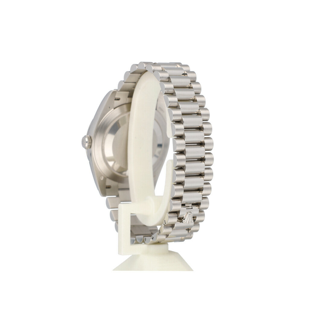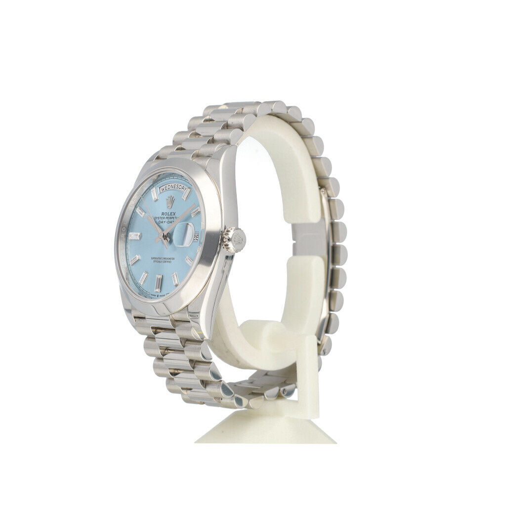In very good condition Rolex Day-Date 40 mm in platina with factory ice blue diamond / baguette dial, platinum domed bezel and platinum President bracelet from 2019 complete with box and papers. Rolex serviced 11-2025 and not worn since. Rolex service certificate included.