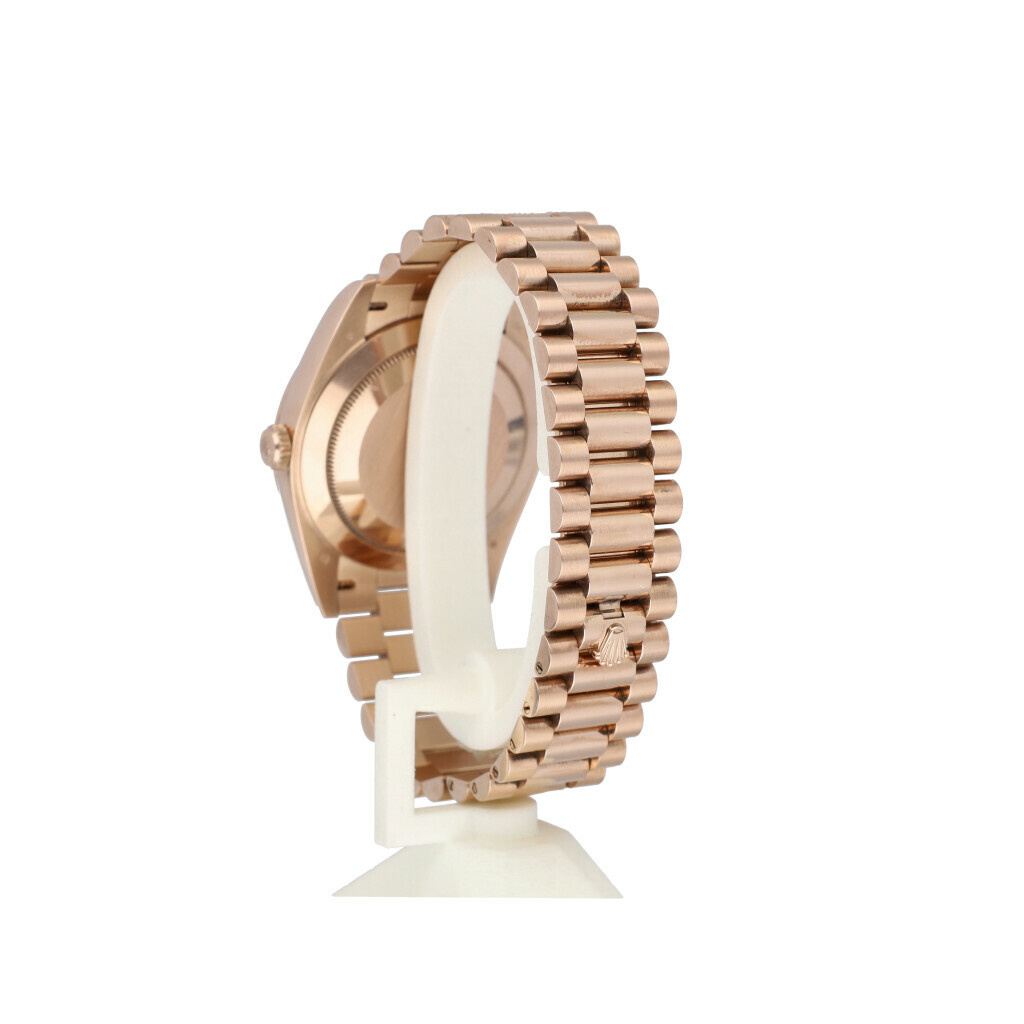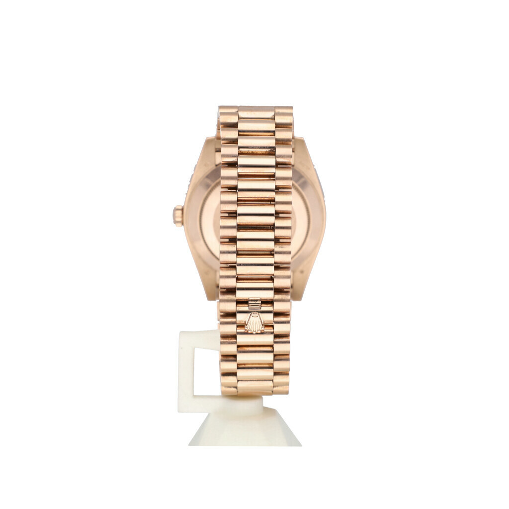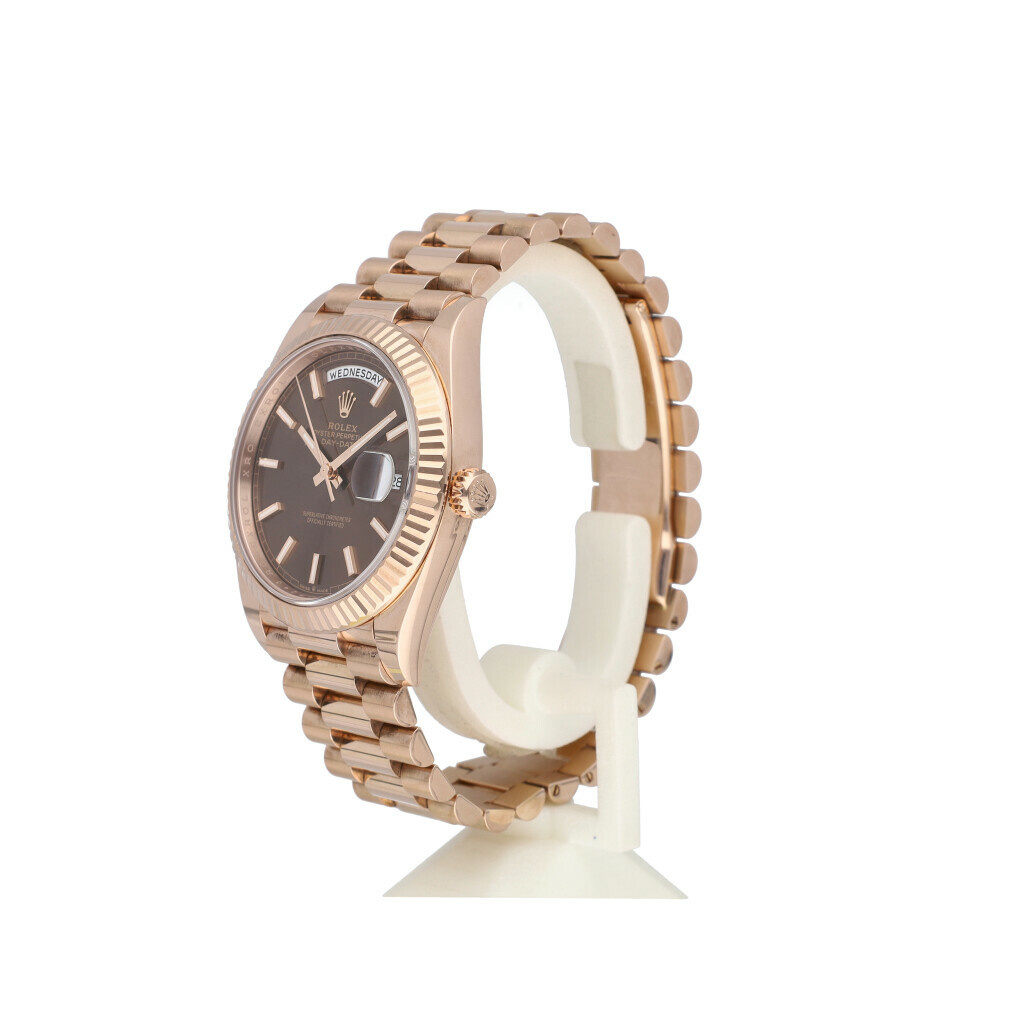 In very good condition Rolex Day-Date in rose gold with chocolate / brown dial, English day wheel, rose gold fluted bezel and rose gold President bracelet from 2024 complete with papers, no box.