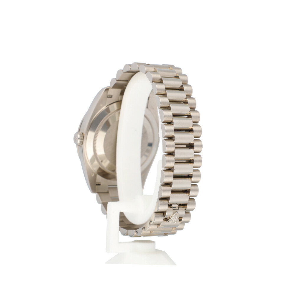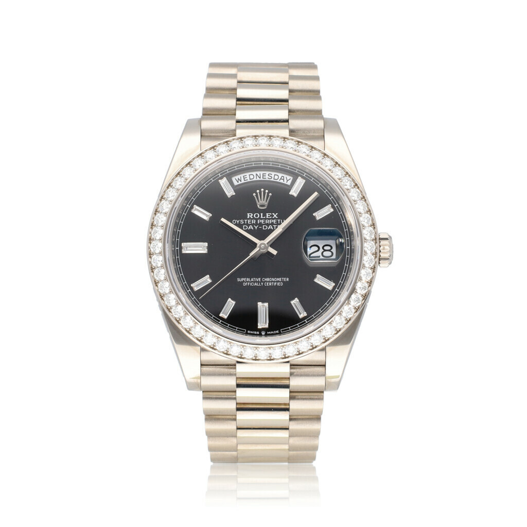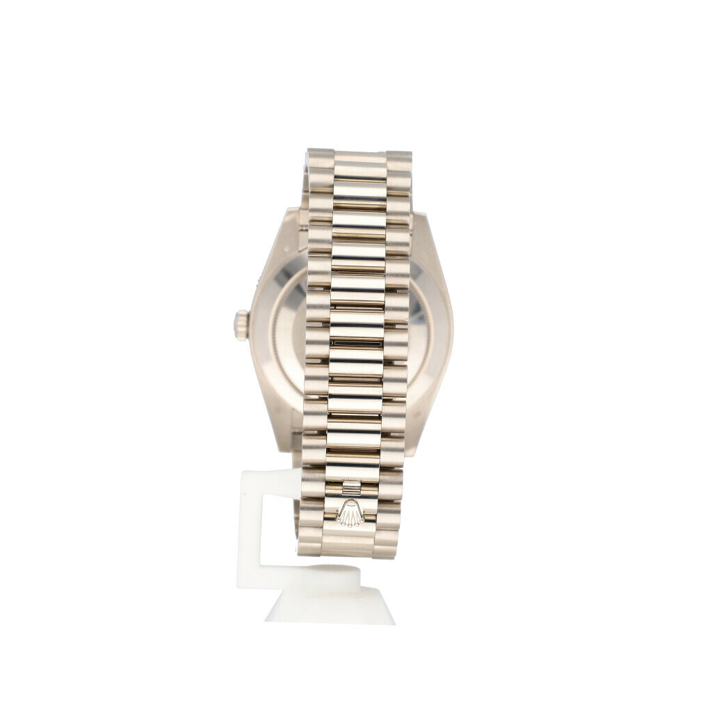 In very good codnition Rolex Day-Date in white gold with black diamond dial, factory diamond bezel and President bracelet from 2021 complete with box and papers.