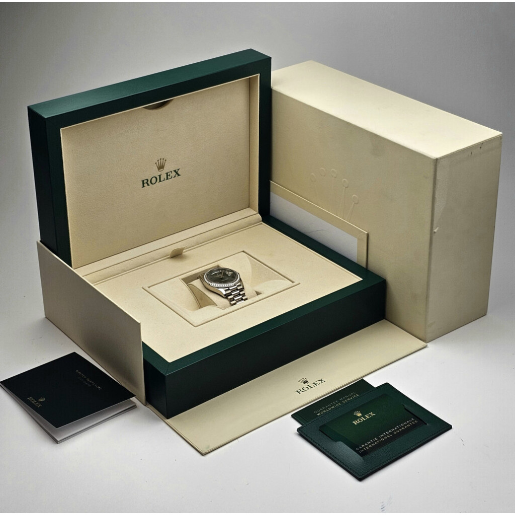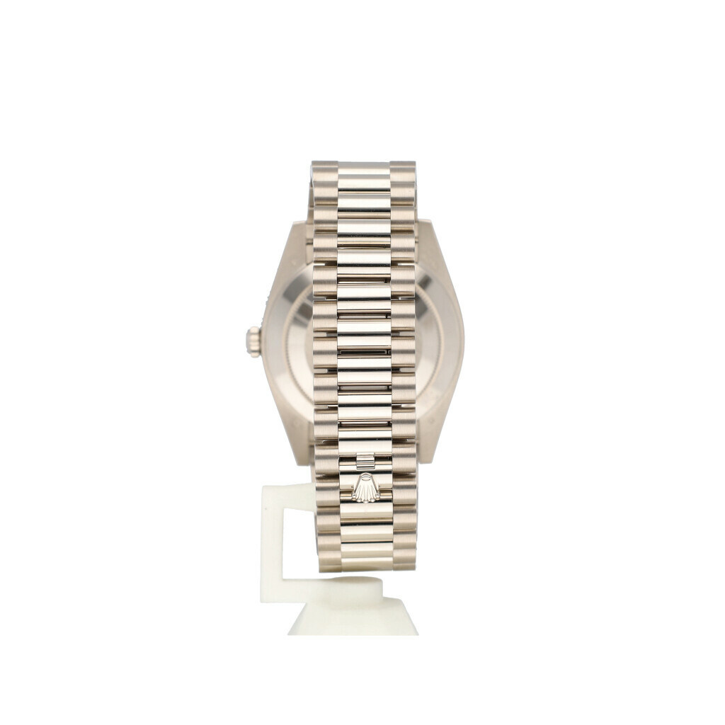 In very good condition Rolex Day-Date in white gold with green so called 'money' dial, factory diamond white gold bezel and white gold President bracelet from 2025 complete with box and papers. 21% VAT deductible when shipped outside of the European Union.