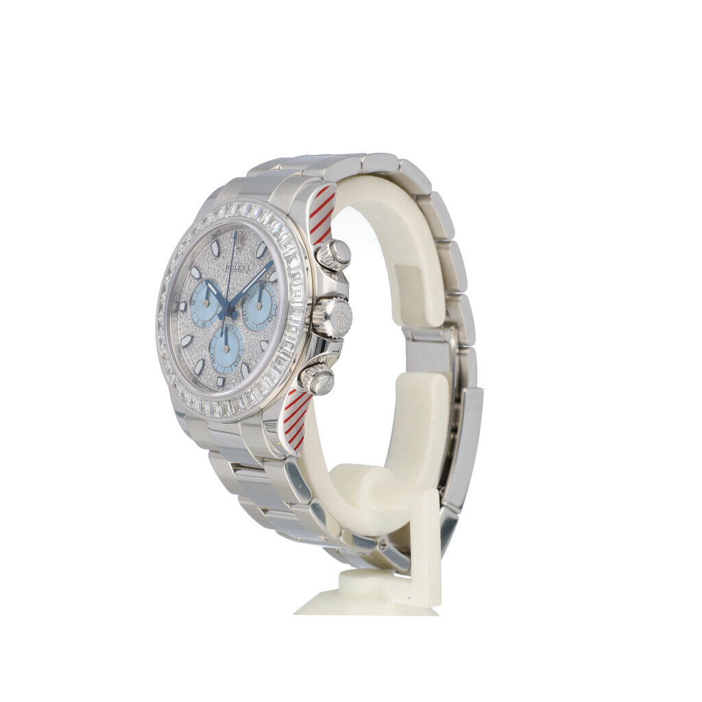 In very good condition Rolex Daytona in Platina with factory diamond pave dial and factory baguette bezel with platinum Oyser bracelet from 2016 complete with box and papers.