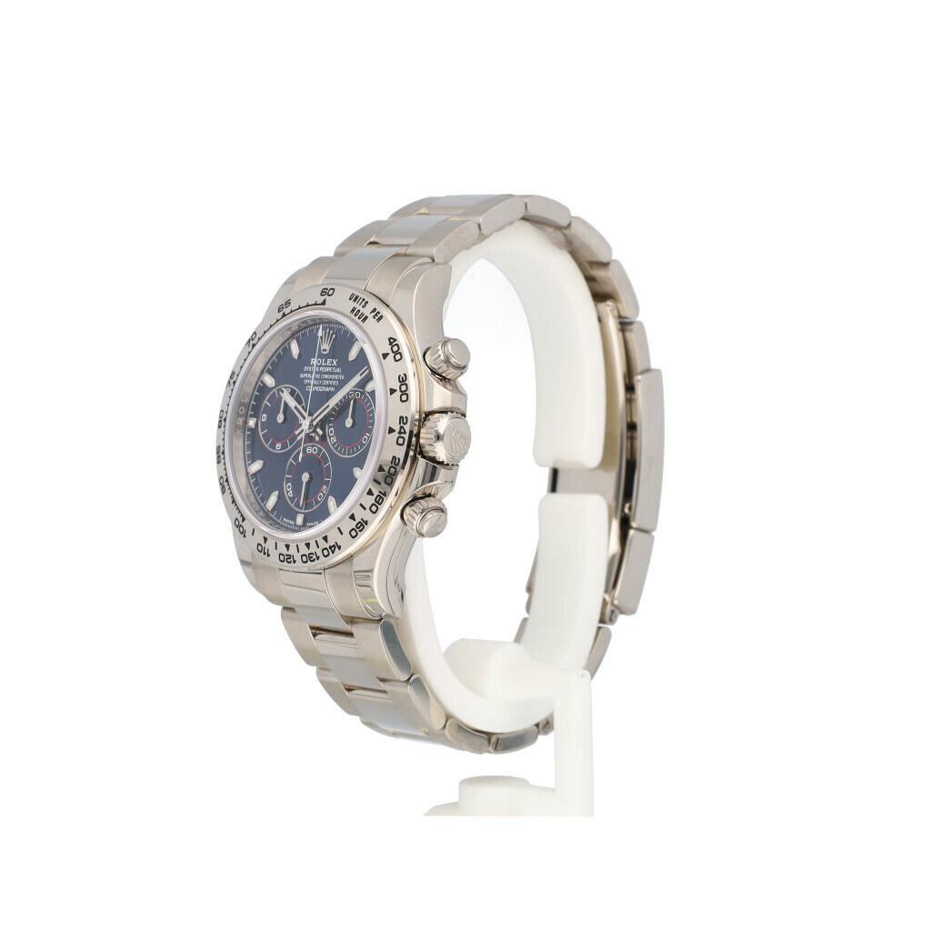 In very good condition Rolex Daytona in white gold with original factory blue dial from 2020 complete with box and papers.