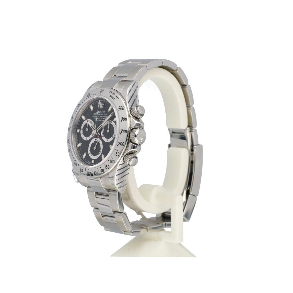 In very good condition Rolex Daytona in steel with black dial, steel bezel and steel Oyster bracelet from 2011 complete with box and papers.