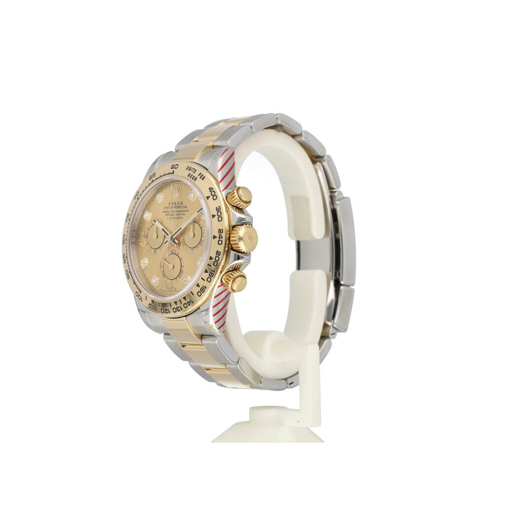 In very good condition Rolex Daytona in steel and yellow gold with yellow gold bezel, champagne diamond dial and steel and yellow gold Oyster bracelet. No box and/or papers.