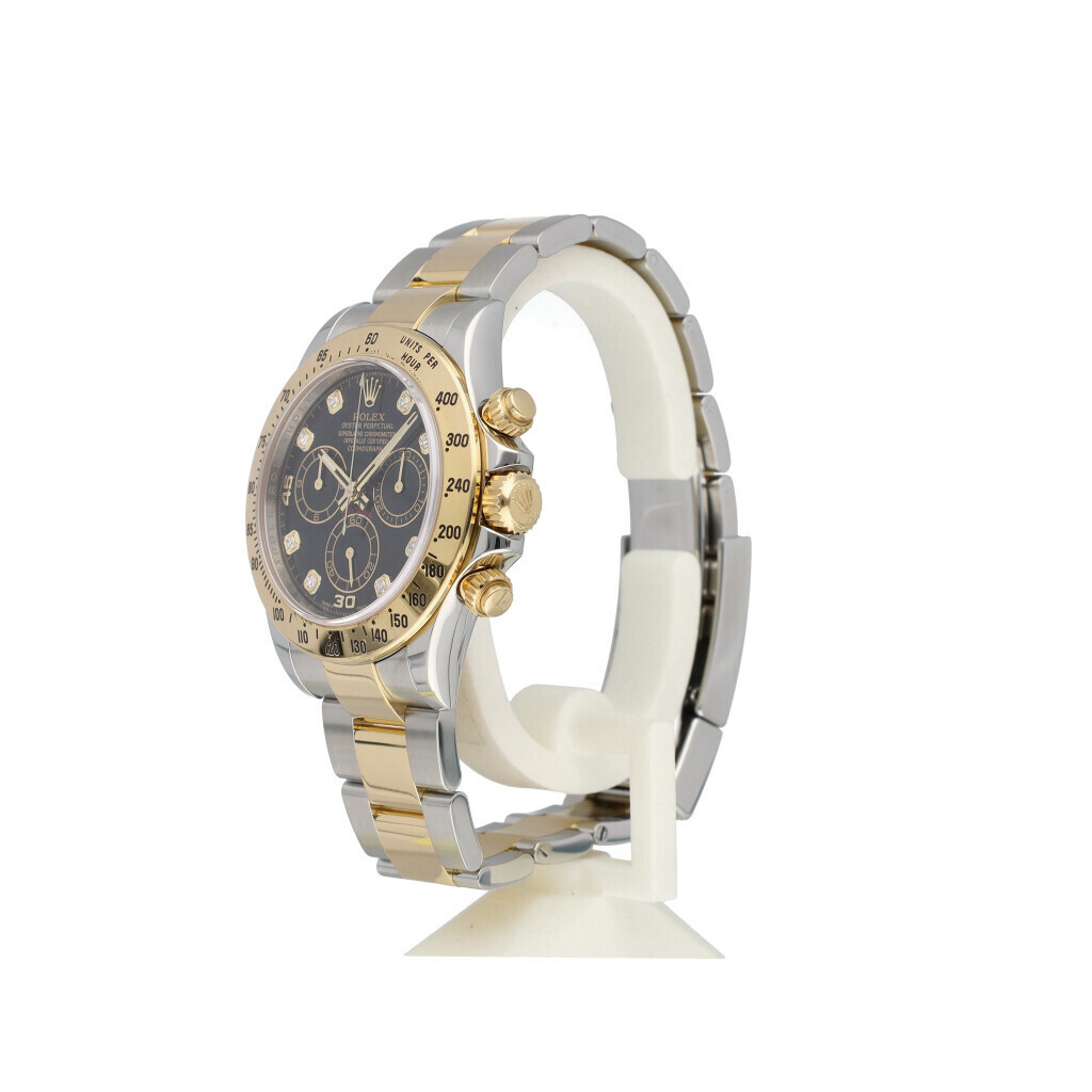 In very good condition Rolex Daytona in steel and yellow gold with factory black diamond dial, yellow gold bezel and steel and yellow gold Oyster bracelet from 2015 complete with box and papers. Rolex serviced 11-2020 and hardly worn since. Rolex service certificate included.