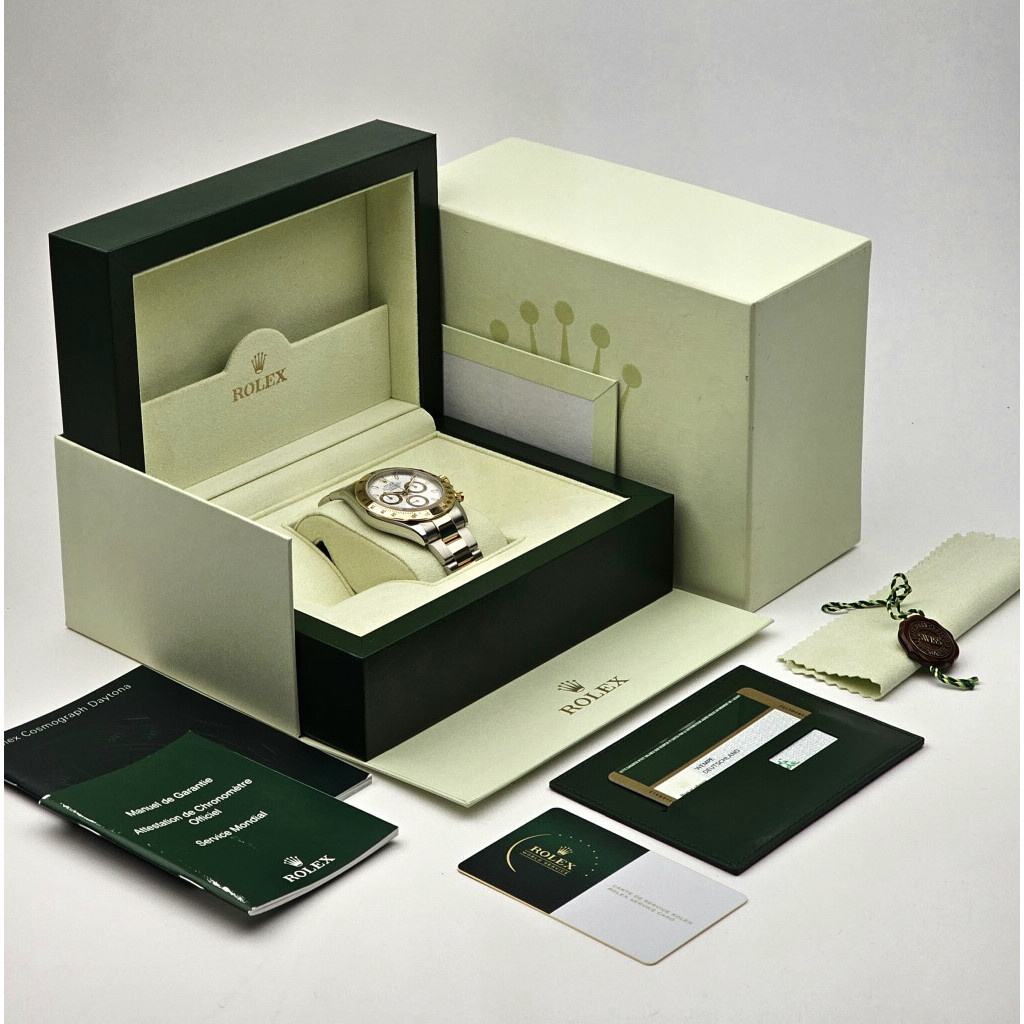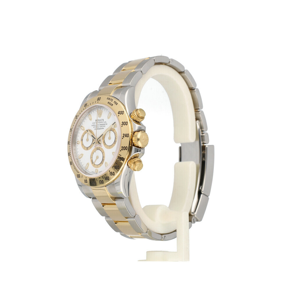 In very good condition Rolex Daytona in steel yellow gold with white dial, yellow gold bezel and steel and yellow gold Oyster bracelet from 2013 complete with box and papers. Rolex serviced 10-2025 and not worn since. Rolex service certificate included.