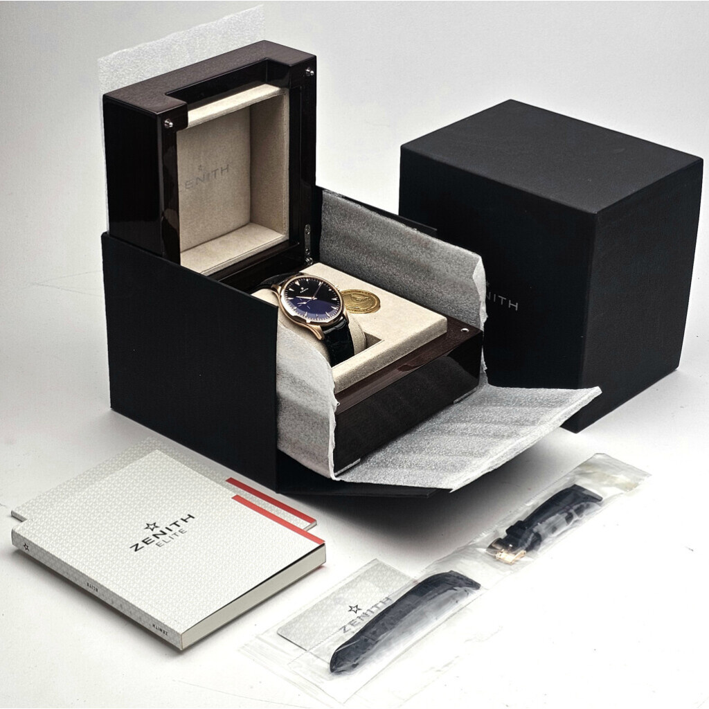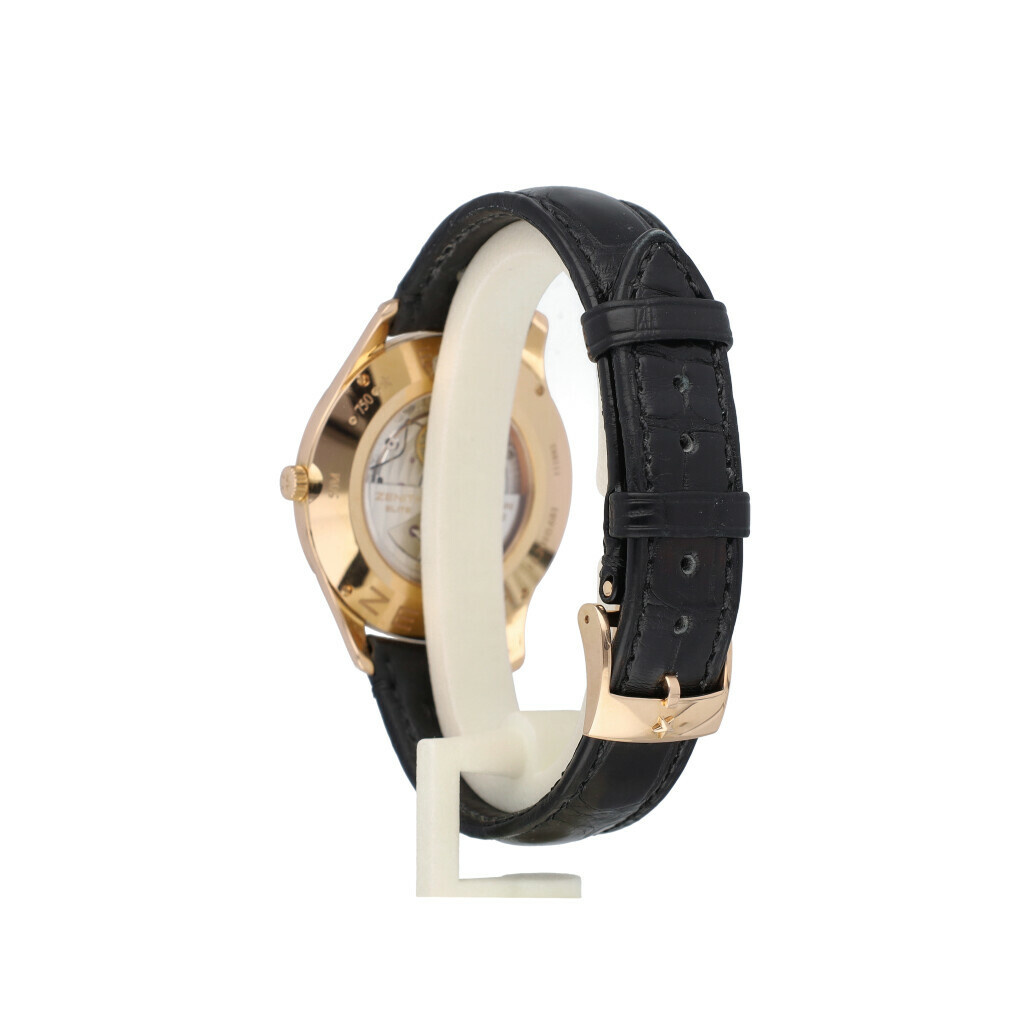 In very good condition Zenith Classic Ultra Thin Small Second in rose gold with black dial and alligator leather strap from 2019 complete with box and papers.