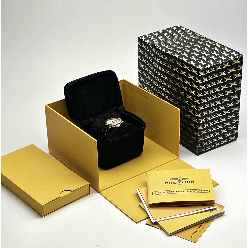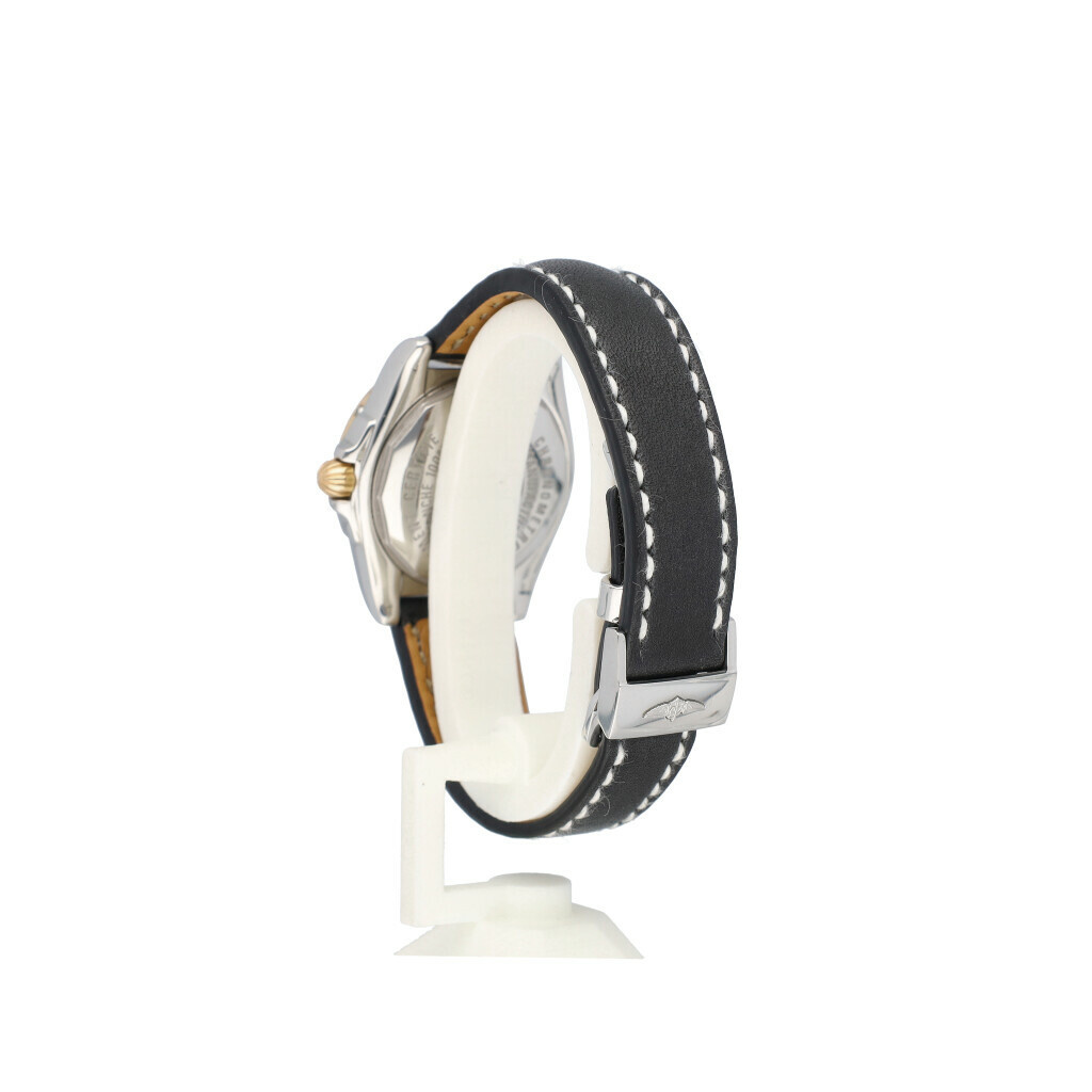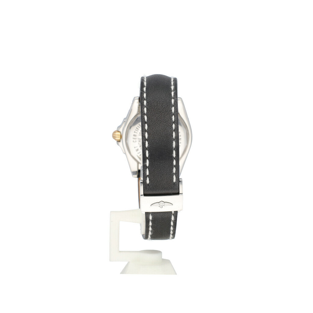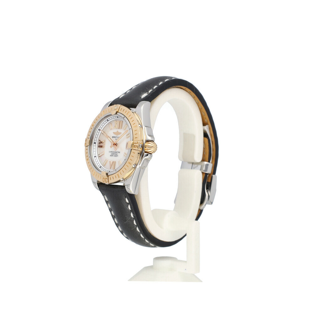 In very good condition Breitling Galactic 32 in steel and rose gold with mother of pearl diamond dial and black leather strap from 2009 complete with papers, no box.