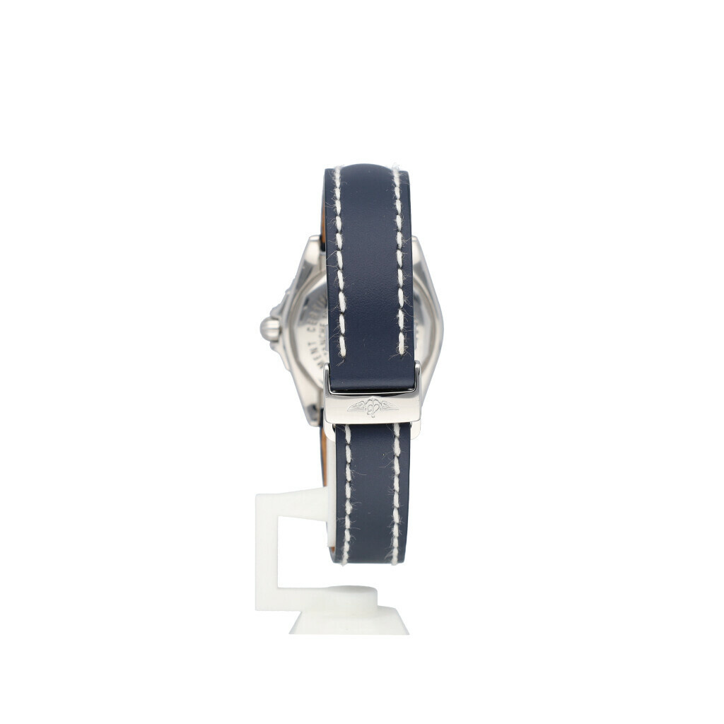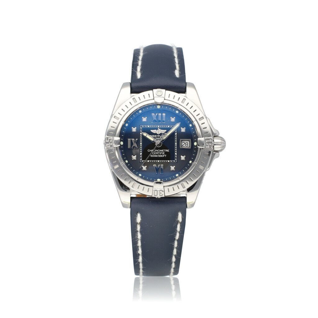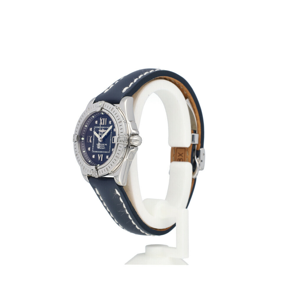 In very good condition Breitling Cockpit Lady in steel with a factory black diamond dial and new black Breitling strap complete with box, no papers. Breilting serviced 3-2025 for € 600,65 and not worn since. Breitling service papers included.