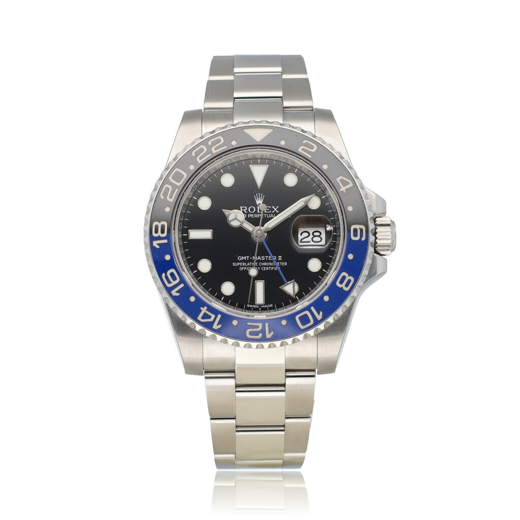In very good condition Rolex GMT-Master II so called Batman with black dial, blue and black cermic bezel and steel Oyster bracelet from 2016 complete with box and papers.