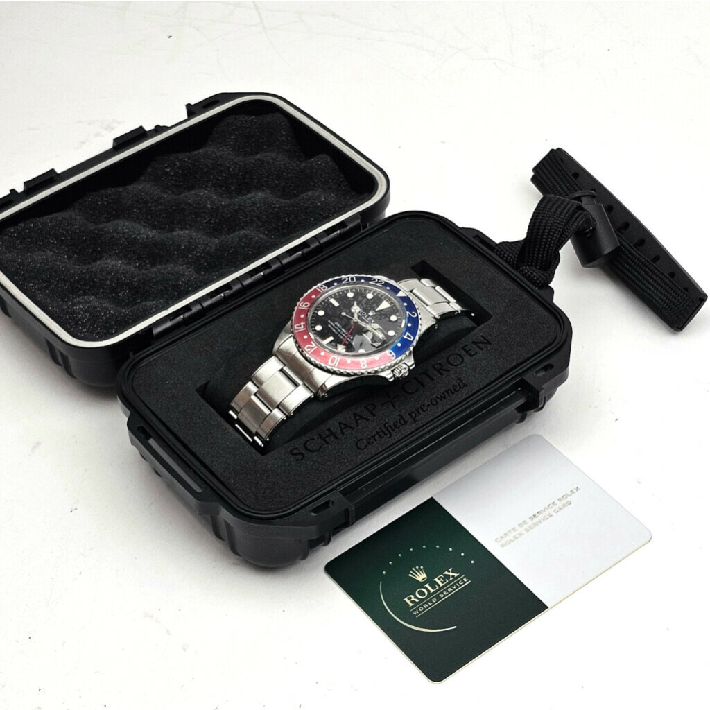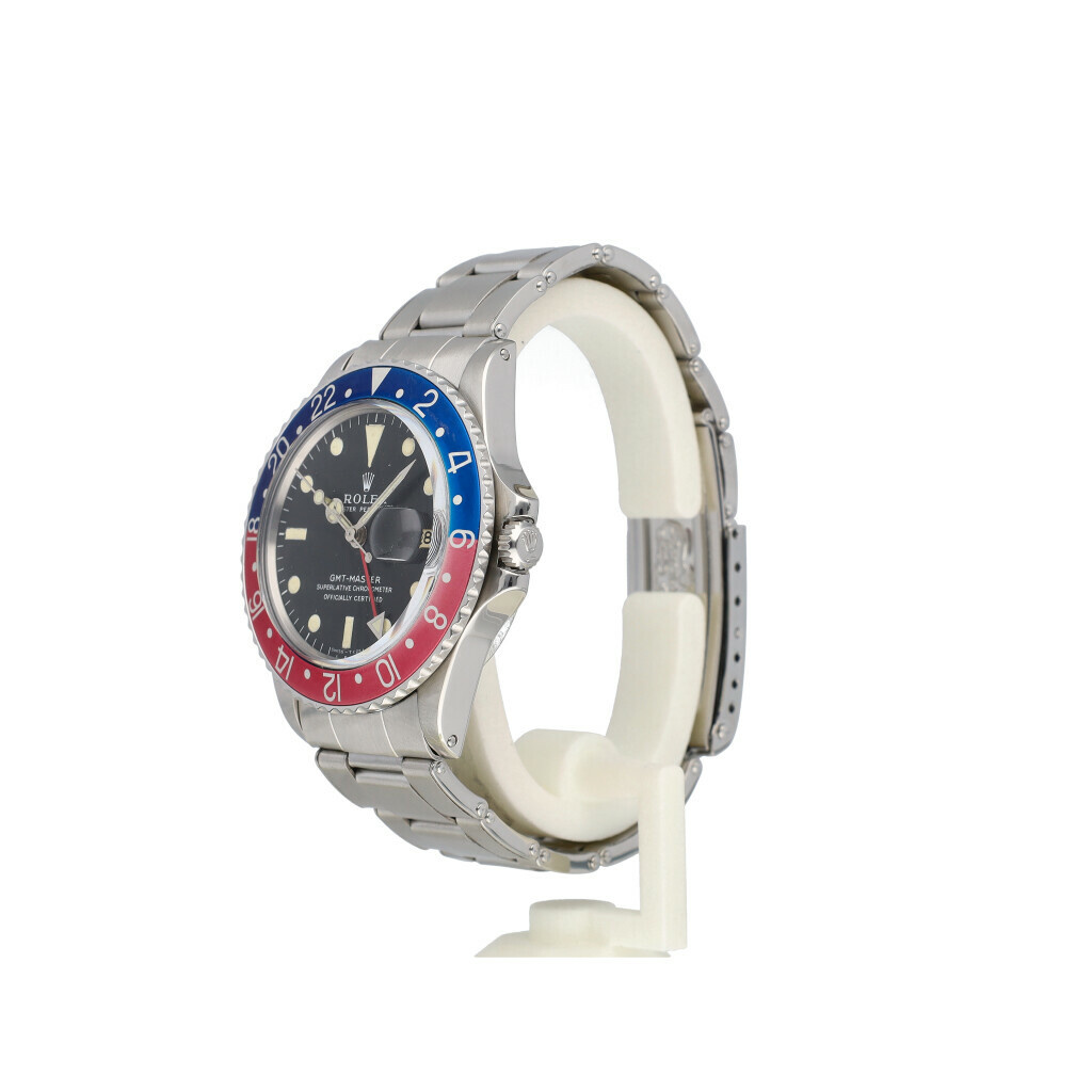 In very good condition Rolex GMT-Master reference 1675/0 in steel so called "Pepsi" with rivet Oyster bracelet and black long E dial from +/- 1970 (2557... serial). No box and/or papers. Rolex serviced 12-2025 and not worn since. Rolex service certificate included.