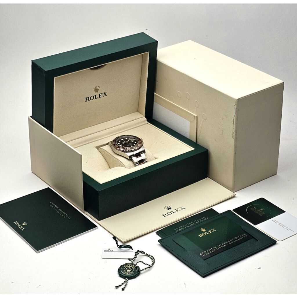 In very good condition Rolex GMT-Master II so called "Rootbeer" in steel and rose gold with black and brown ceramic bezel and steel and rose gold Oyster bracelet from 2022 complete with box and papers. Rolex serviced 2-2026 and not worn since. Rolex service certificate included.