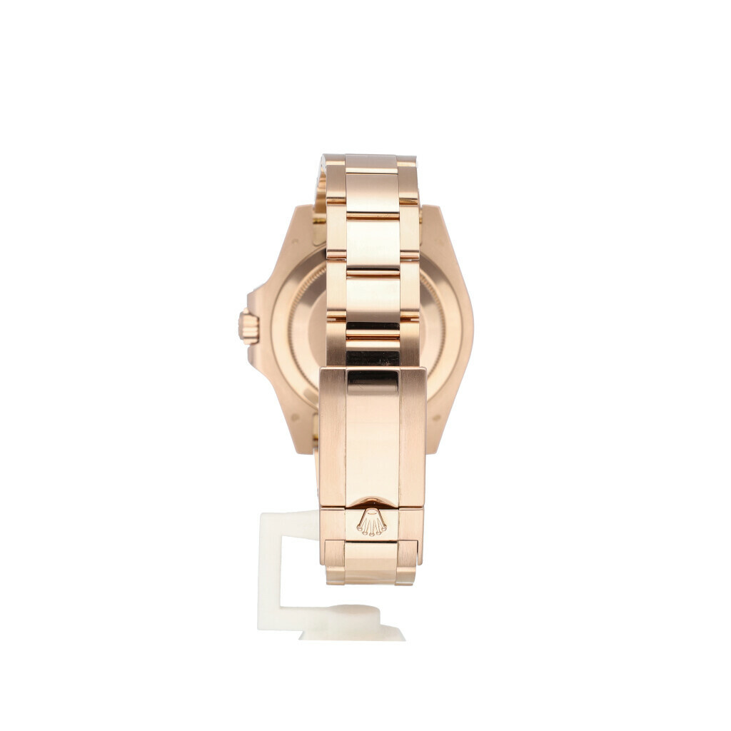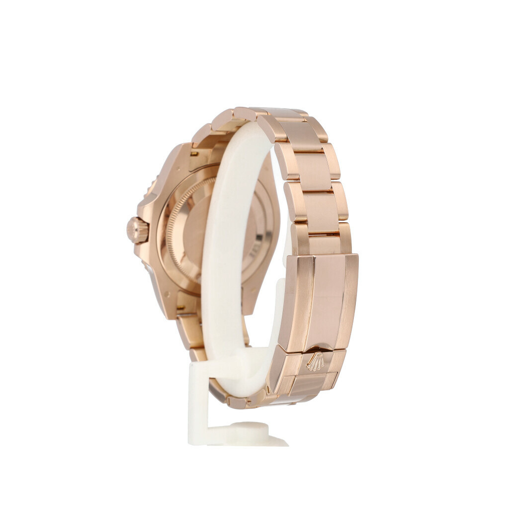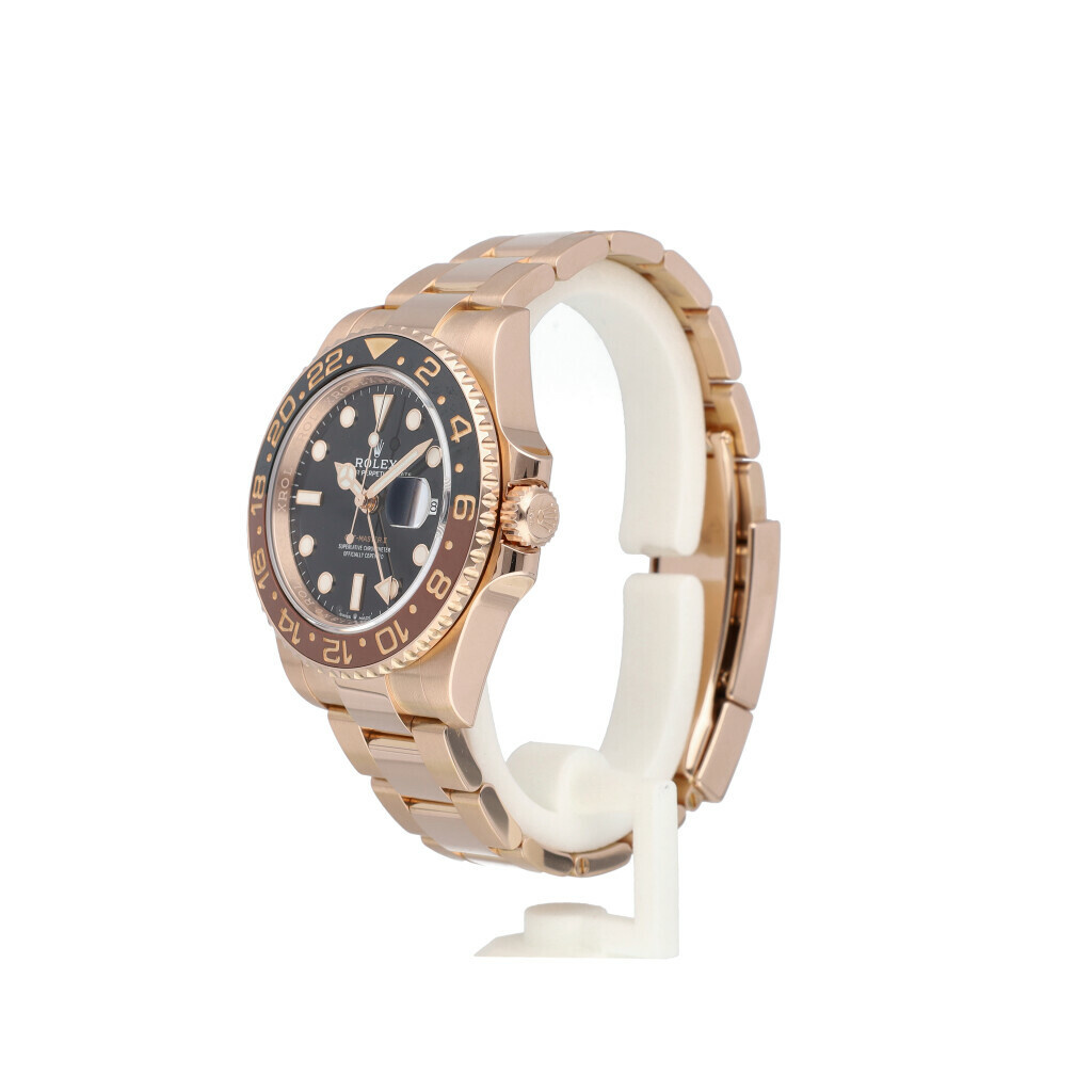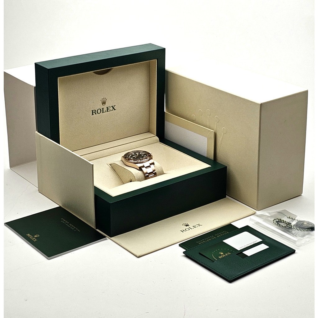 In very good condition Rolex GMT-Master II in rose gold with black dial and rose gold Oyster bracelet so called 'rootbeer' complete with box, no papers. Rolex serviced 4-2025 and not worn since. Rolex service certificate included.