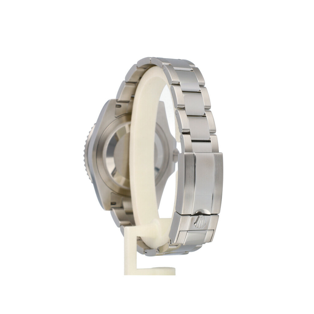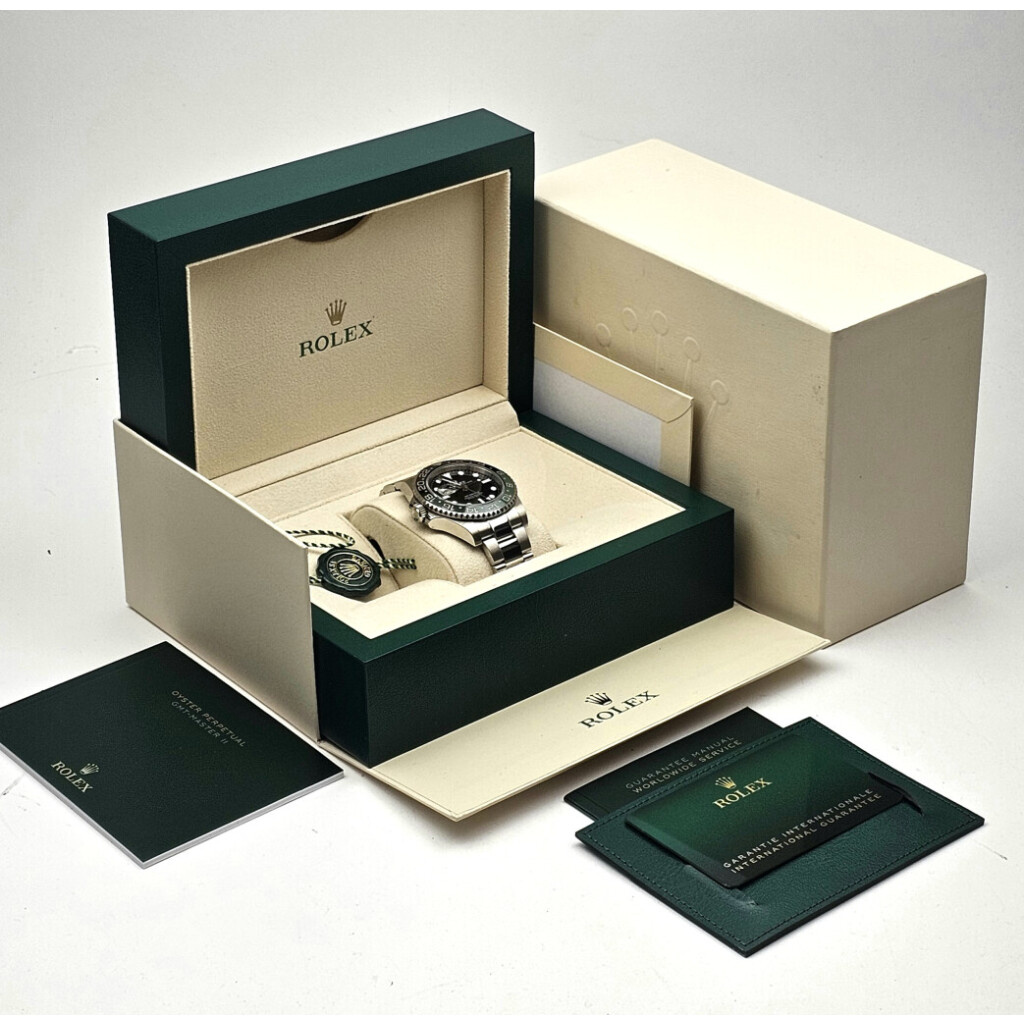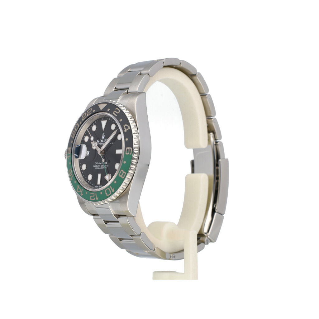 In very good condition Rolex GMT-Master II left handed so called 'Sprite' in steel with black and green ceramic bezel and steel Oyster bracelet from 2024 complete with box and papers
