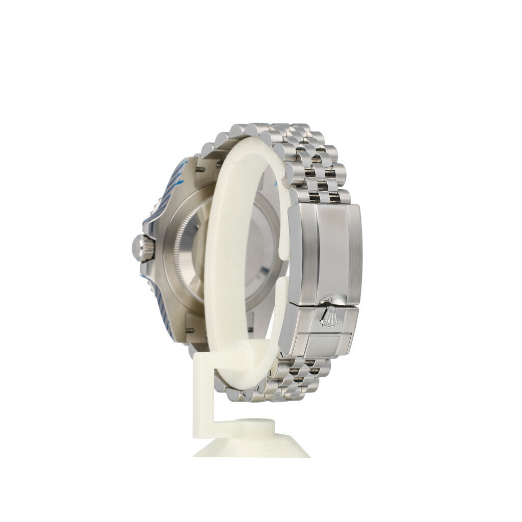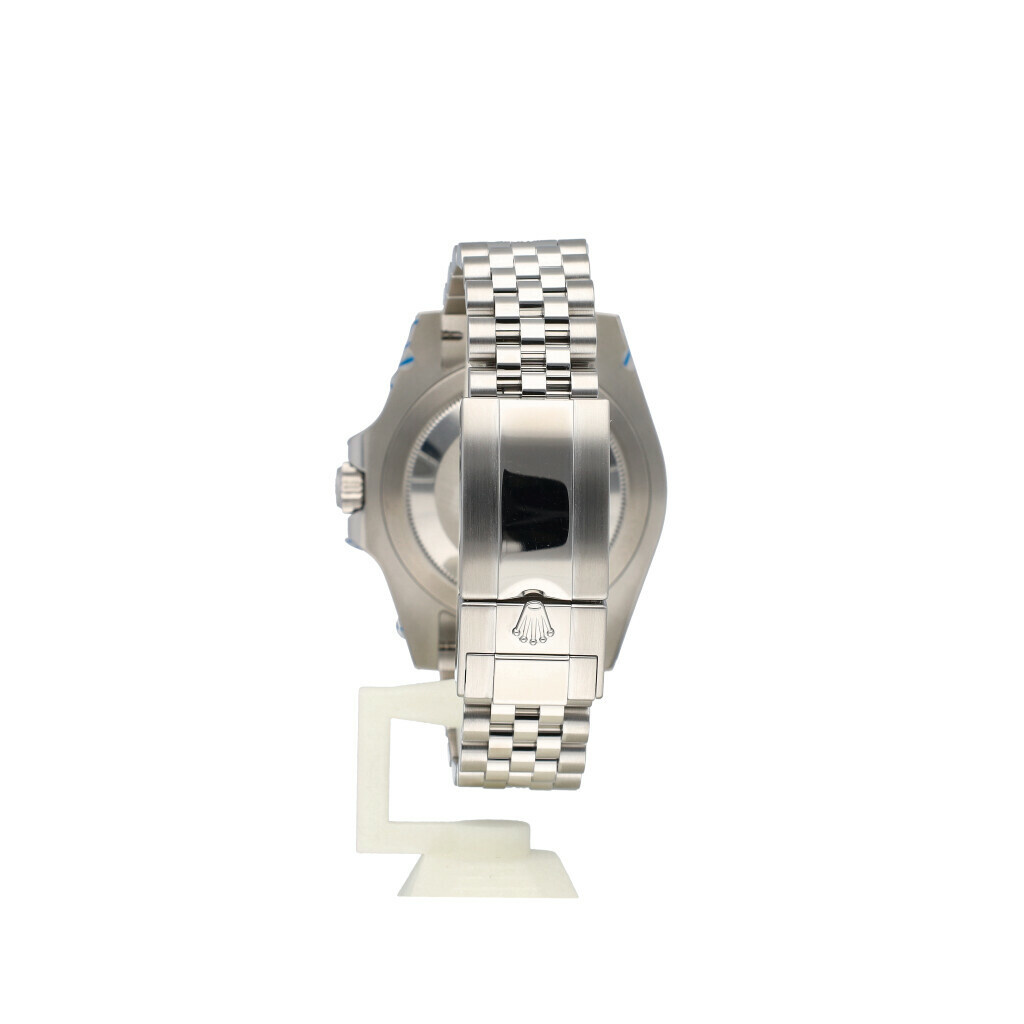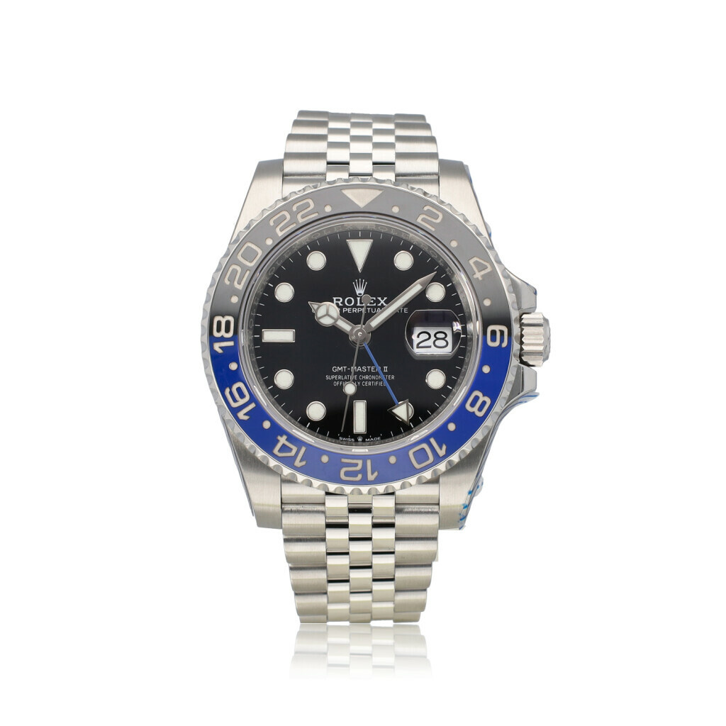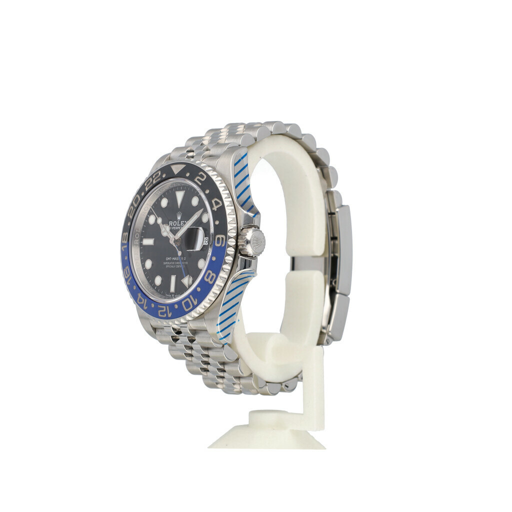 In very good condition Rolex GMT-Master II so called 'Batman' in steel with black dial, blue and black bezel and steel Jubilee bracelet from 2019 complete with box and papers. Rolex serviced 6-2025 and not worn since. Rolex service certificate included.
